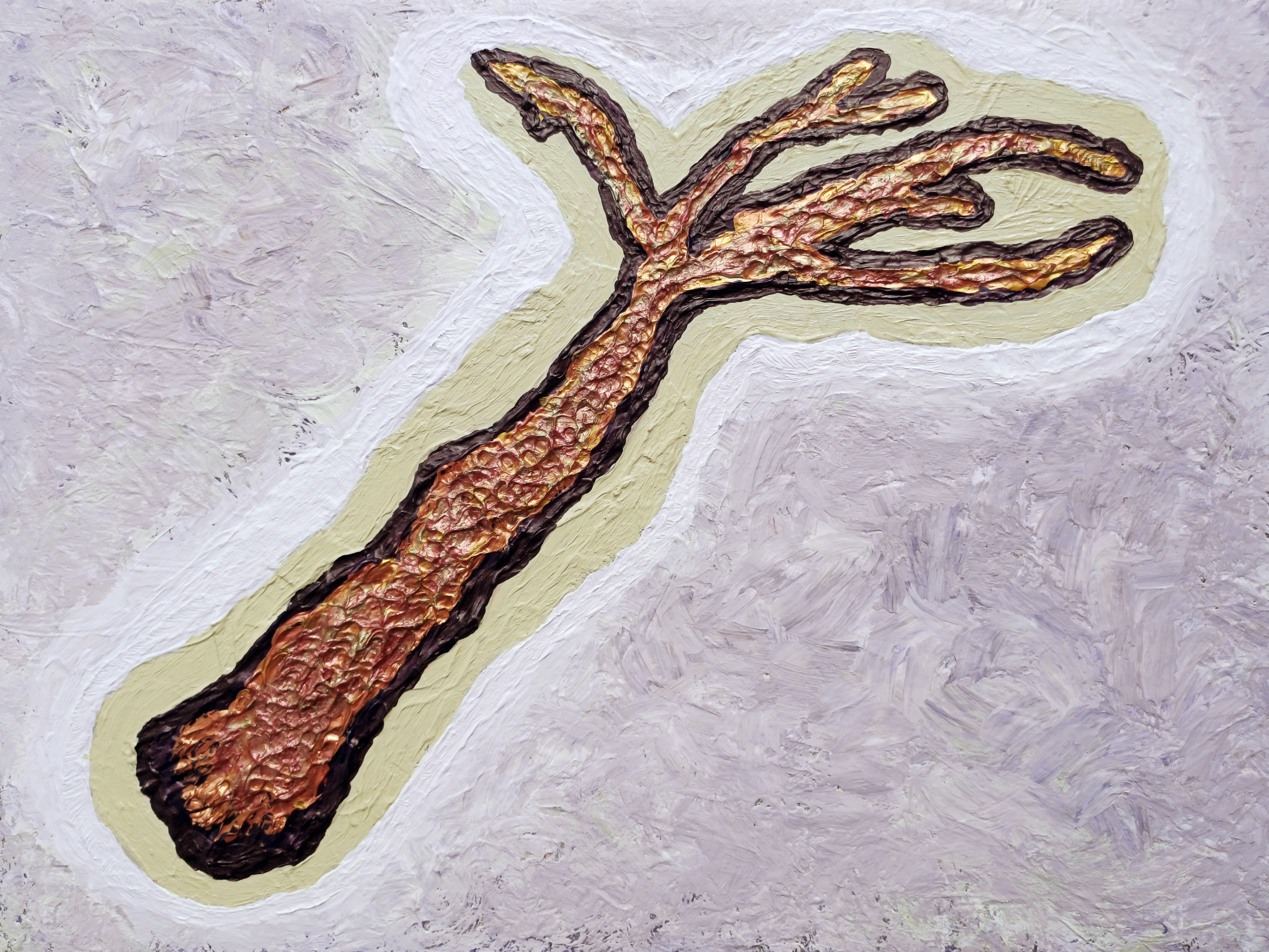 In “Oak Eyes” I have stripped away the expected greens and browns of the English countryside to reveal a heightened chromatic vibrancy, an amalgamation of ideas brought into focus.