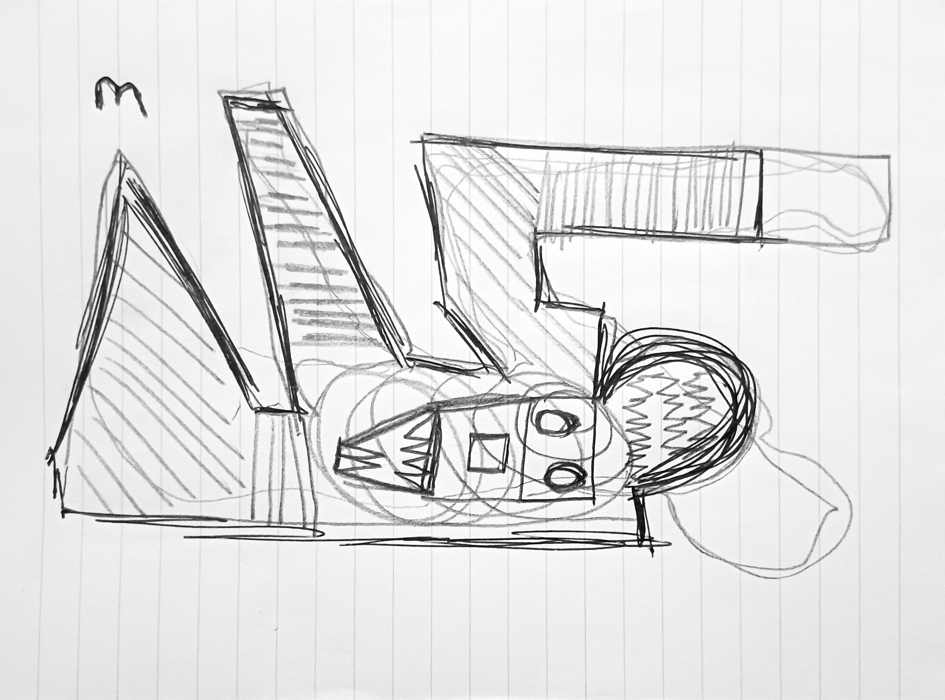 • Study drawing (notepad, lined): angular A-like left mass + jigsaw-like leg; arm-bar stretching upwards (highest pencil shape), stylised facial totem nested in the body; linear hatching; a circular peg-coil (the original head with its adjacent arm); missile at this point is the intended triangular head looking up towards ‘m‘!