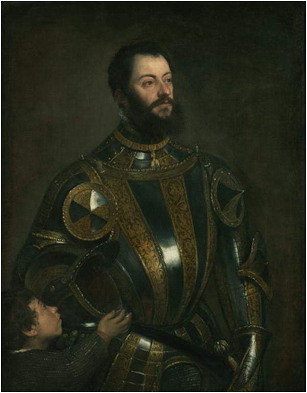 Returning to the portrait for the purpose of my Blog – instantly we see solid substance and grandeur in this d’Avalos pose. The inclusion of a page boy enforces the idea that Alfonso d’Avalos is a physically mighty man in stature held in high military regard. His armour is painted strong in every sense with the metal reflecting white light in a robust manner and with remarkable perceptible depth.