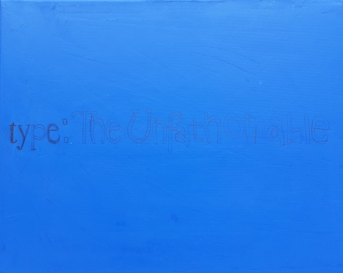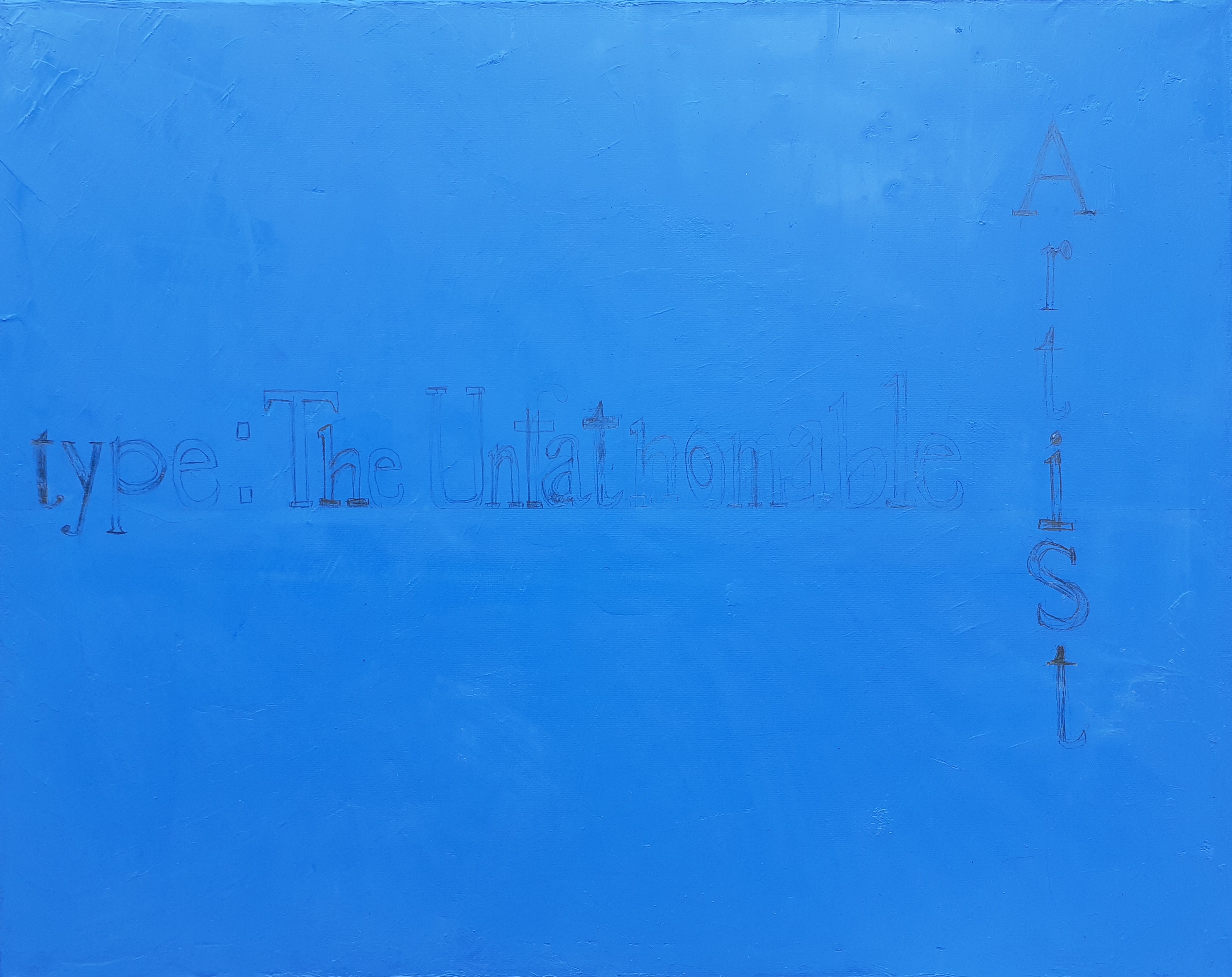Photograph above is ‘type: The Unfathomable’ in ITC Kristen font. The sketched text shown is with HB carbon pencil. Background oil colours are Aquamarine, Cerulean Blue and Titanium White with a refined linseed oil, mixed together, then applied onto the canvases using one palette knife. The palette knife was kept low to the canvases in a consistent swishing motion for uniformity.