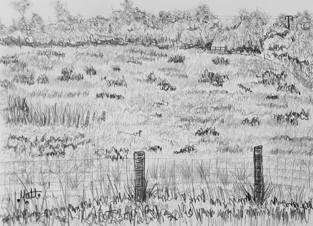 I believe this to be such pretty a view, instantly I wanted to sketch the vista. Interestingly dog training and cow grazing have featured in this very field near to my local lake.