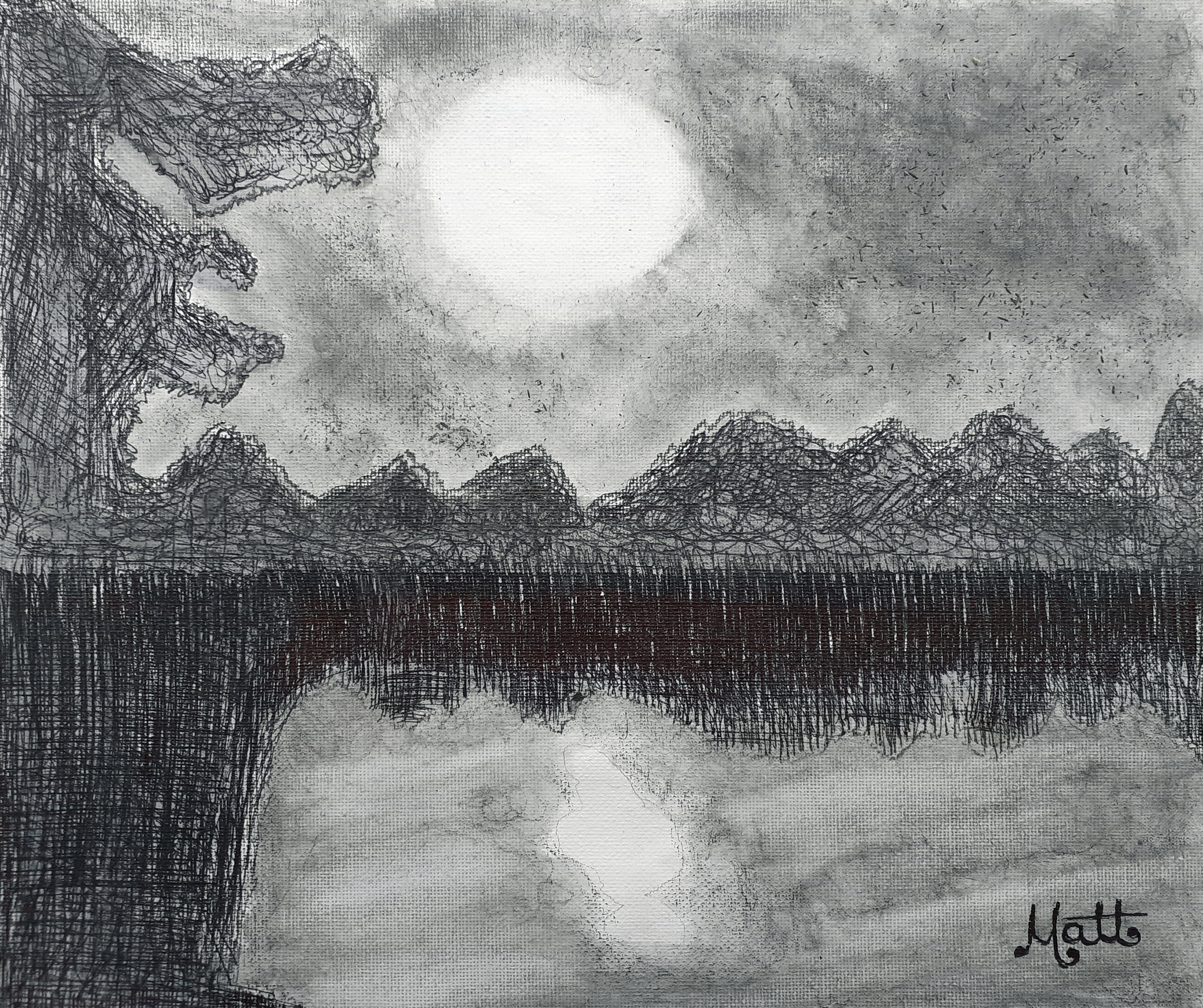 In this sketch the Moon shows Earth its own reflection. The tree to the left is landmass shaped as viewed from space. Carbon pencil filaments are sprinkled into the sky to explain the need for recycling materials. Farground trees look like mountains, we want them to be here forever.