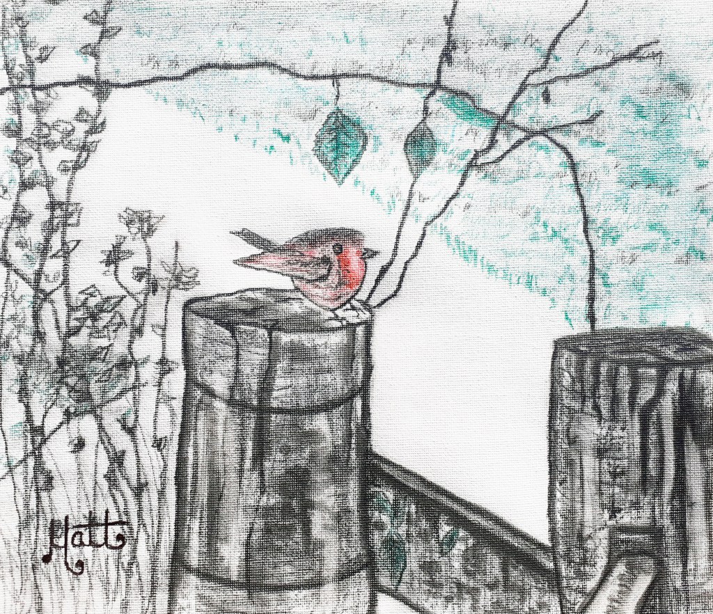 dear Robin then skipped two feet to the left, onto the wooden post you see here in my sketch. It was there dear Robin stood whilst I happily took portrait photographs. A curious face is clearly visible between the wooden posts. Once again in this instance, the curious face was pure random chance.