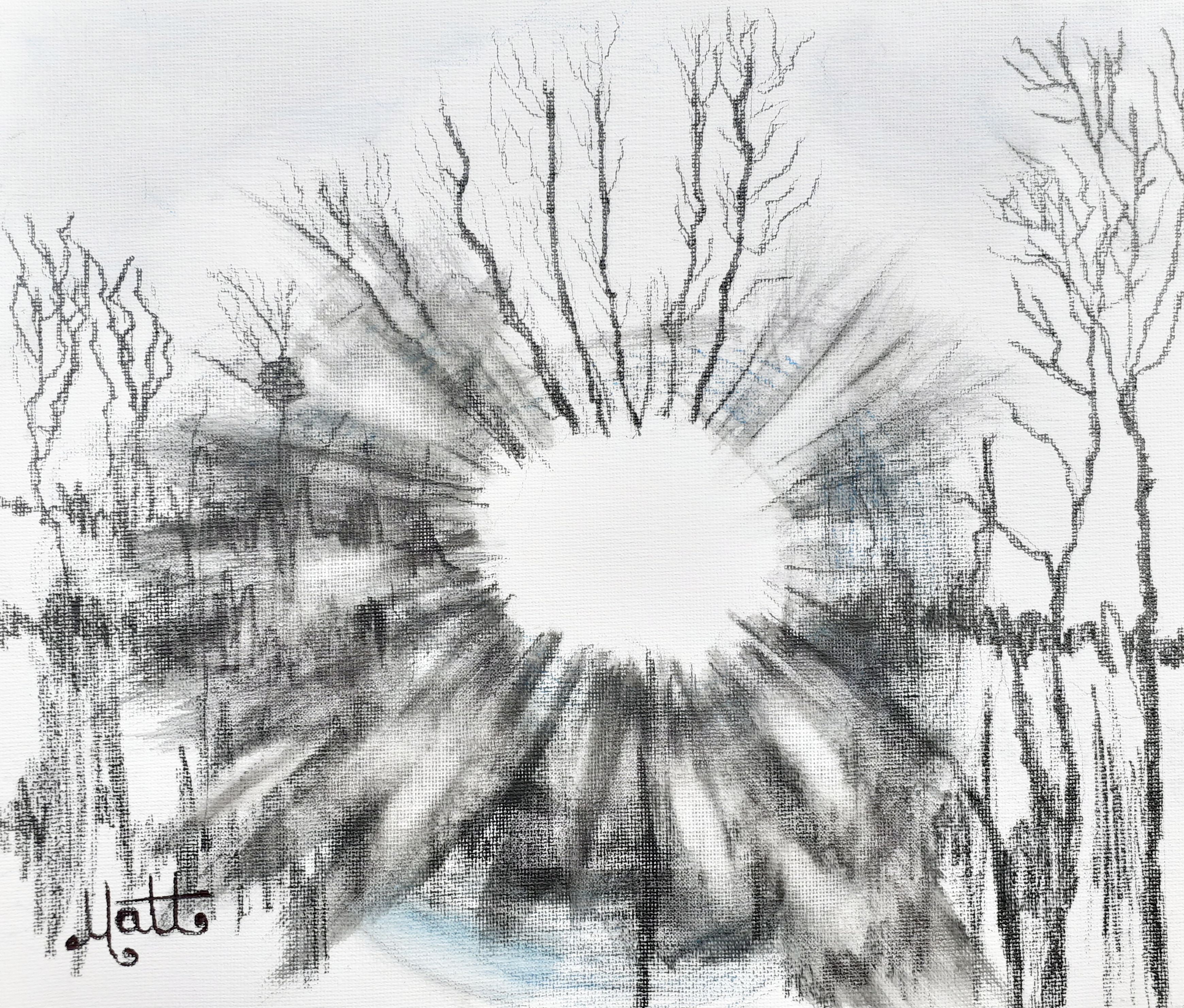 I try to bring the blue haze lightflare, mid-lower of the photograph, into this pencils artwork with a dash of blue colour pencil.