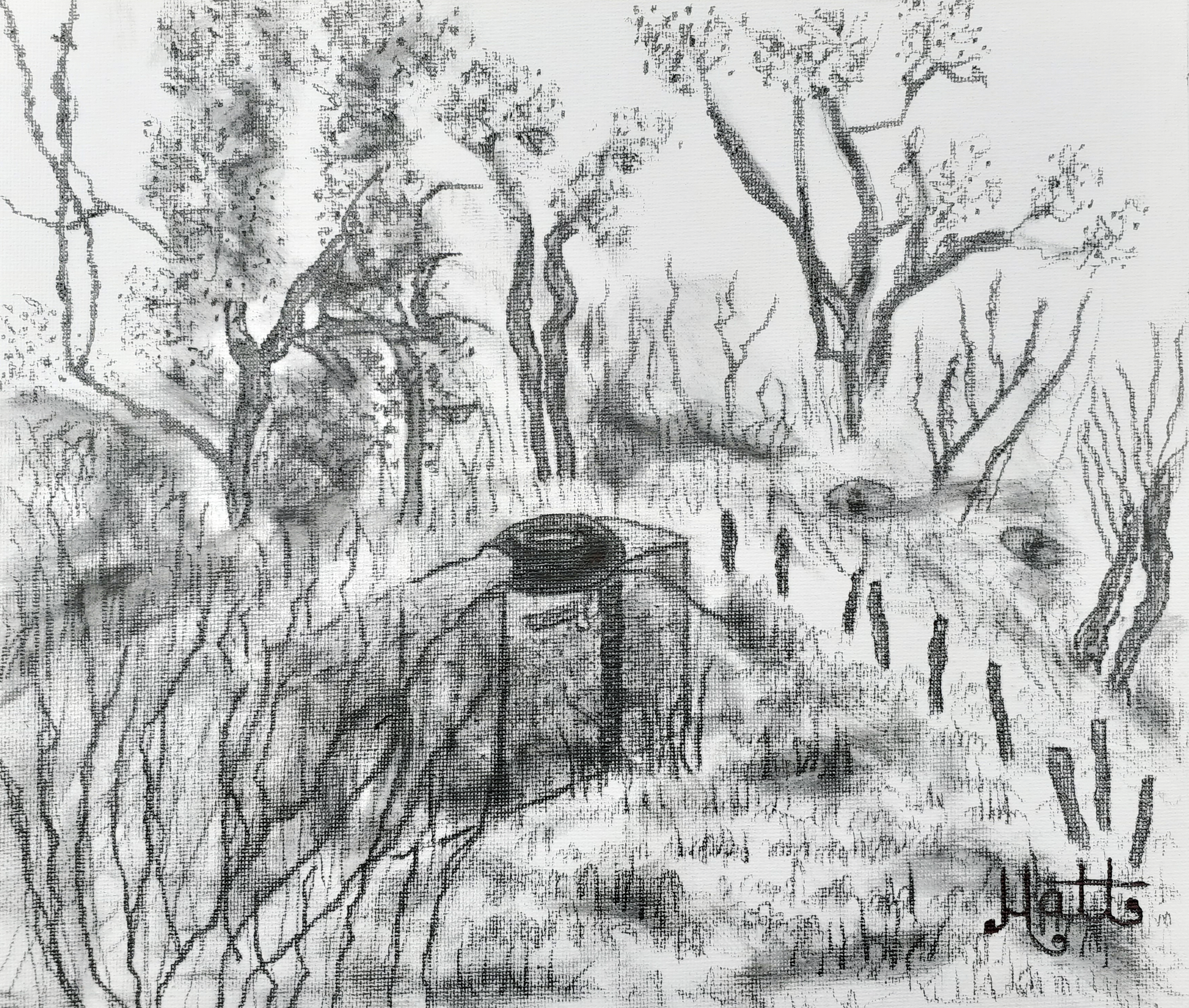 “Rusted Cart of the Nature Reserve” [11th/12th February 2022] by Matt The Unfathomable Artist, drawing with black ink, H, HB, 4B and 8B pencils, signed in black ink on 280gsm 250mm x 300mm gesso primed canvas [pad], digitally edited image 3468  x 2938 pixels.