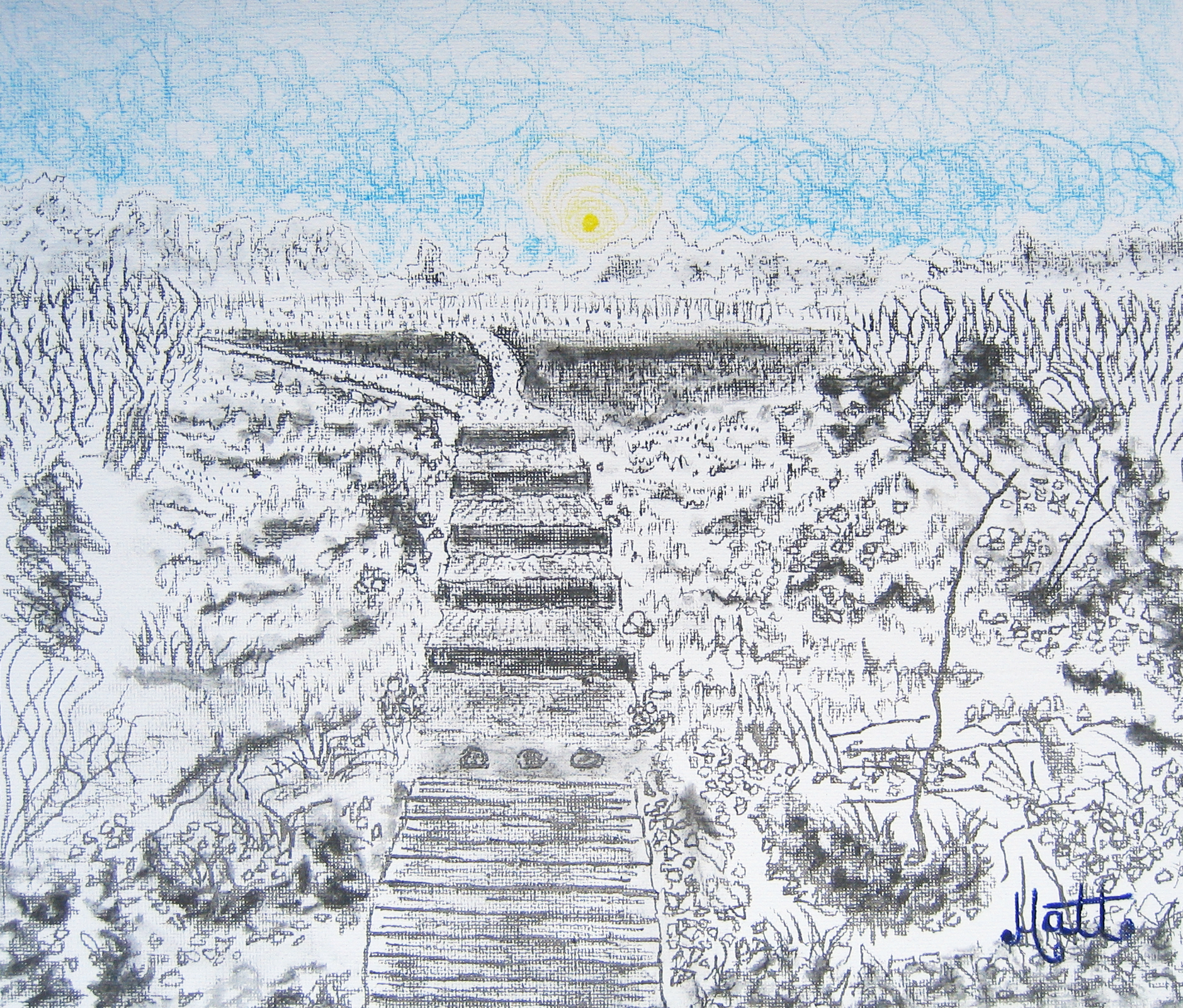 My second draft took under 25 minutes – in this draft I redrew some elements of the wooden walkway bridge, brought colour to the Sun and created the ‘steel structured’ blue sky lines.