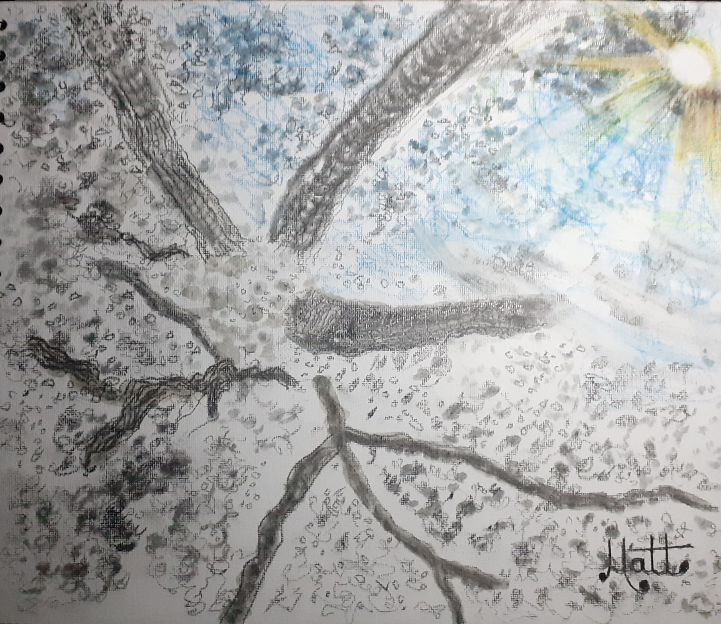 “new draft last night late. haven’t sketched in one of the branches yet. might add a sun ray later. it looks nicer on the canvas. it made me happy doing this. i will keep this one sketchy raw prolly.”