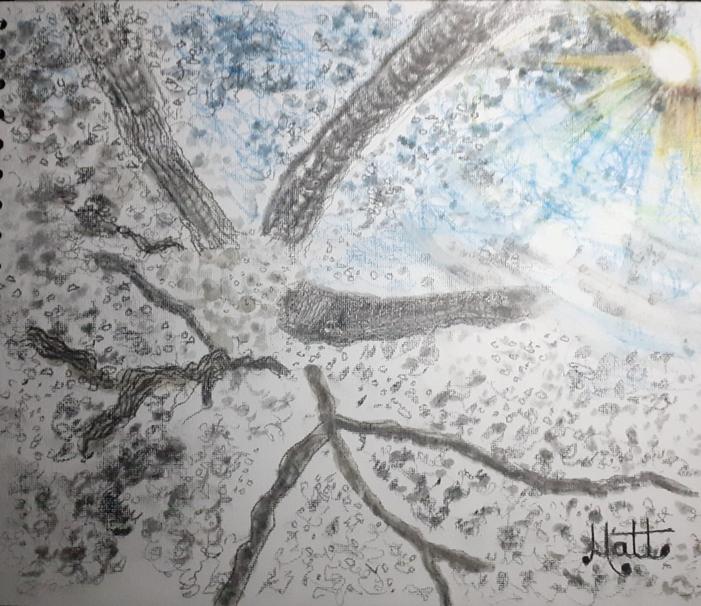 My sketch composition shown above is from a photograph taken 19th May 2020 in the afternoon.  My sketch is a fair impressionistic view of the photograph.  I could make this sketch ‘more spectacular’.  I decided to stay true with the original image.  This is how I see the sun shining.  Simplistically beautiful.