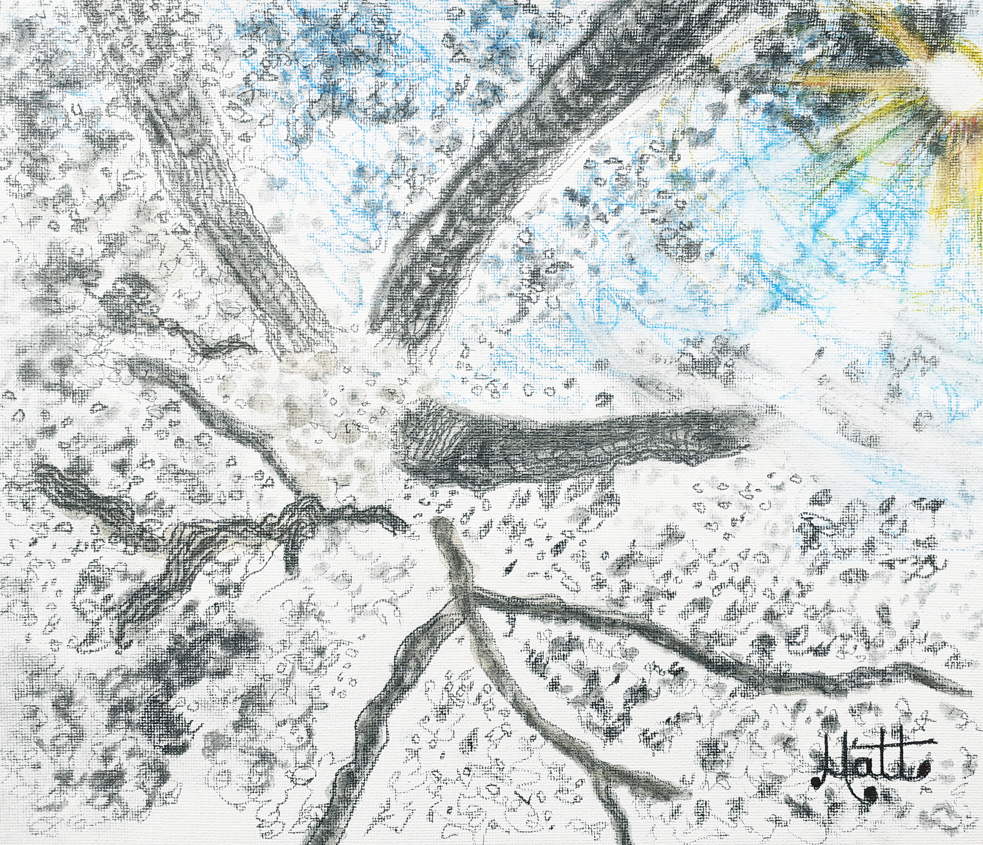 “King James VI & I Oak of 1612 Branches in Sunlight” [1st February 2023] by Matt The Unfathomable Artist, drawing with H, HB, 4B, 8B, sky blue, sunlight yellow and bright red pencils,