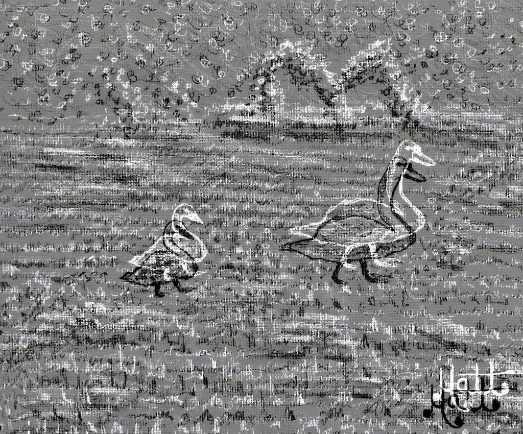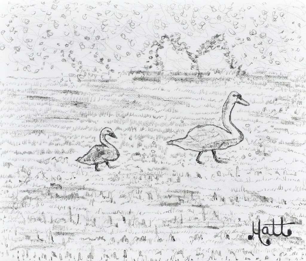 My sketch features row upon row of ‘M’ grasses, an ‘M’ bush (originating in the actual photograph itself, see below), Van Gogh style outlines of the swans (heavily pronounced like fruit in a bowl), whimsical illustrative leafy details and individual character to both the swan and the cygnet.