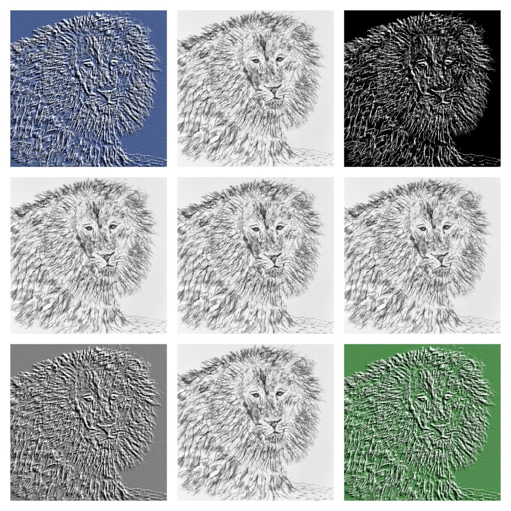 Immediately shown above is the Original pencils drawing of “Lion at Rest”. I then proceeded to make five digital artworks from the Original. Four individual colour compositions in embossed format – ‘Silver’, ‘Green’, ‘Blue’ and ‘Black&White’.