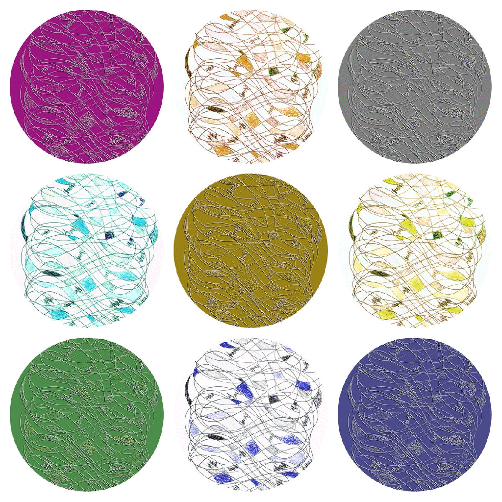 “Geometric Lines #1 – Nine Grid Colorised Collage Circles” softens the visuals in my opinion. The subtle black space allows the viewer a certain distance of separation from artwork to artwork. This likely provides greater ability to process the details. Whilst additionally confining each artwork to fill its individual paradigm.