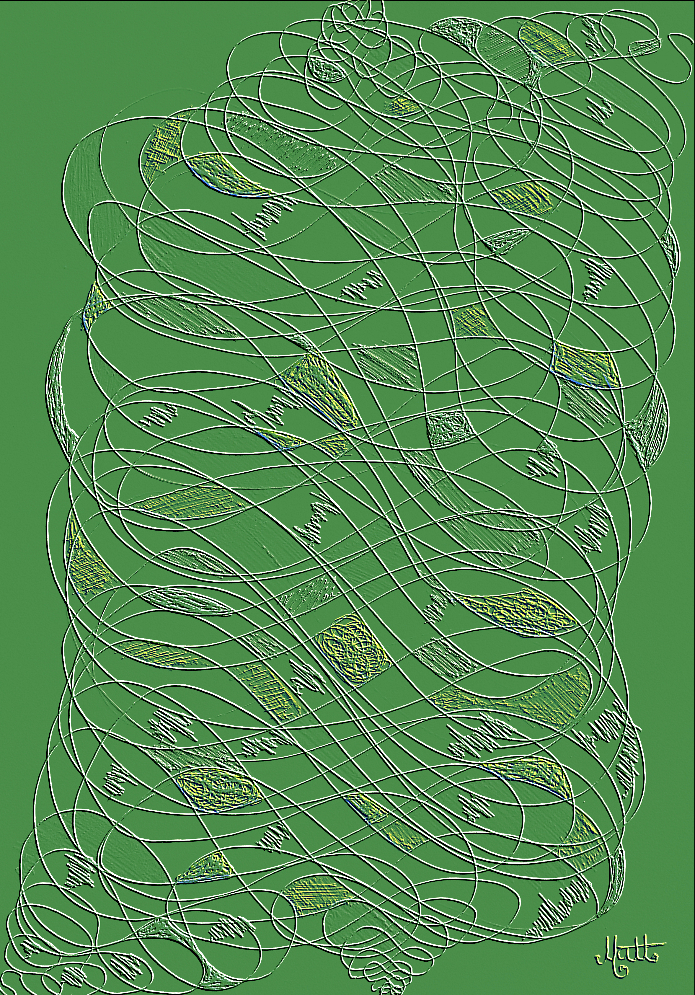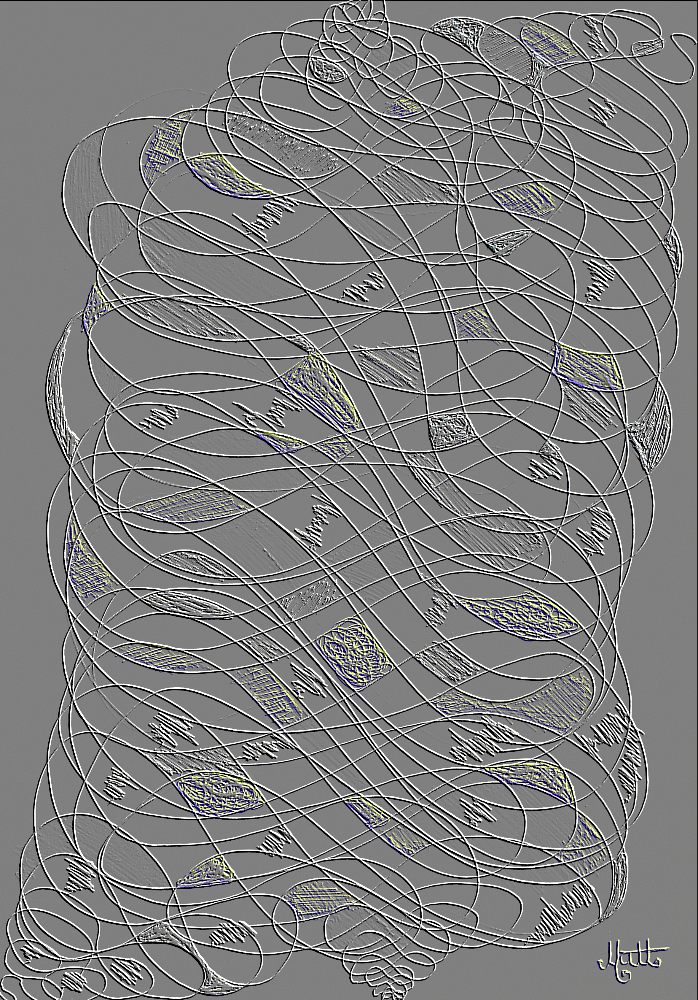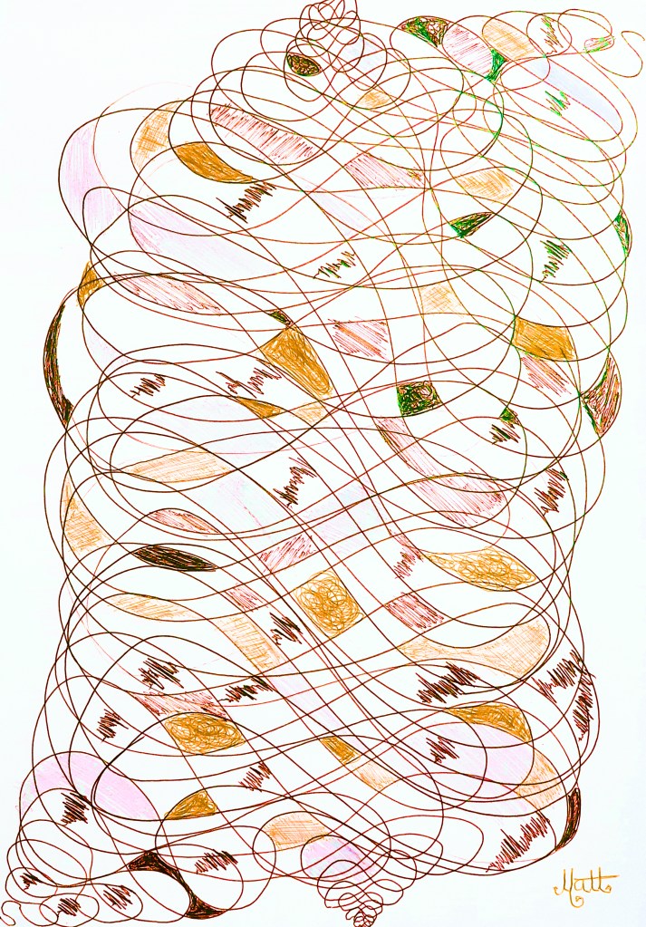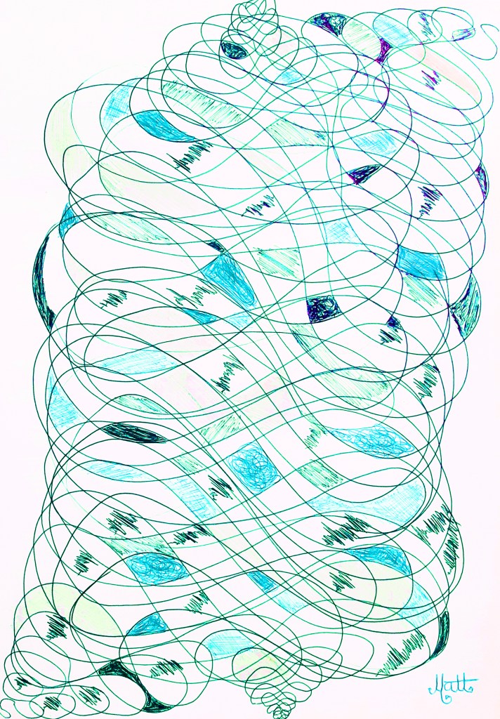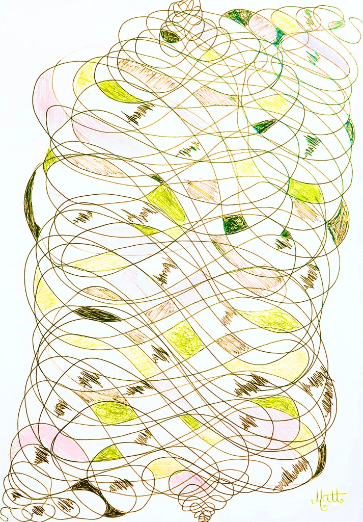 I encourage you to try to emulate this style on a piece of paper. Make your own hand drawn Geometric Lines. In effect this is a learning work at school with spirals and mathematical drawing tools.