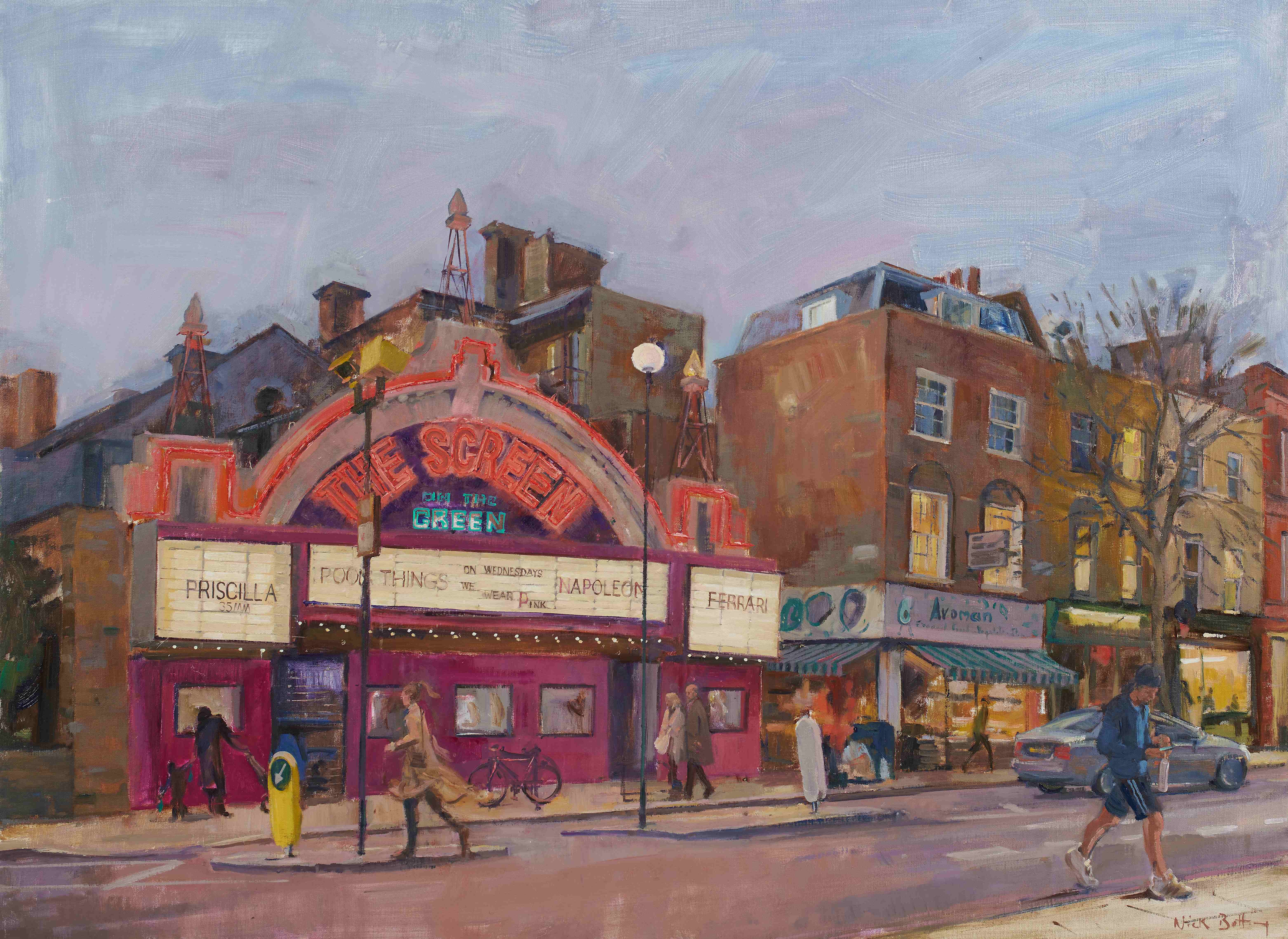 In his painting ‘The Screen on the Green, Nightfall’ for example (shown immediately above), we see the dramatic contrast between the old and the new London. There is the pastel glow in the sky of an early sunset broken by the neon lights of The Screen on the Green (one of the oldest cinemas in the UK having opened in 1913), while further down the street the warm interior of an Avoman shines out onto the pavement.