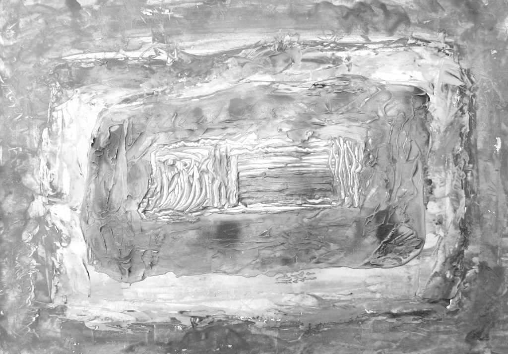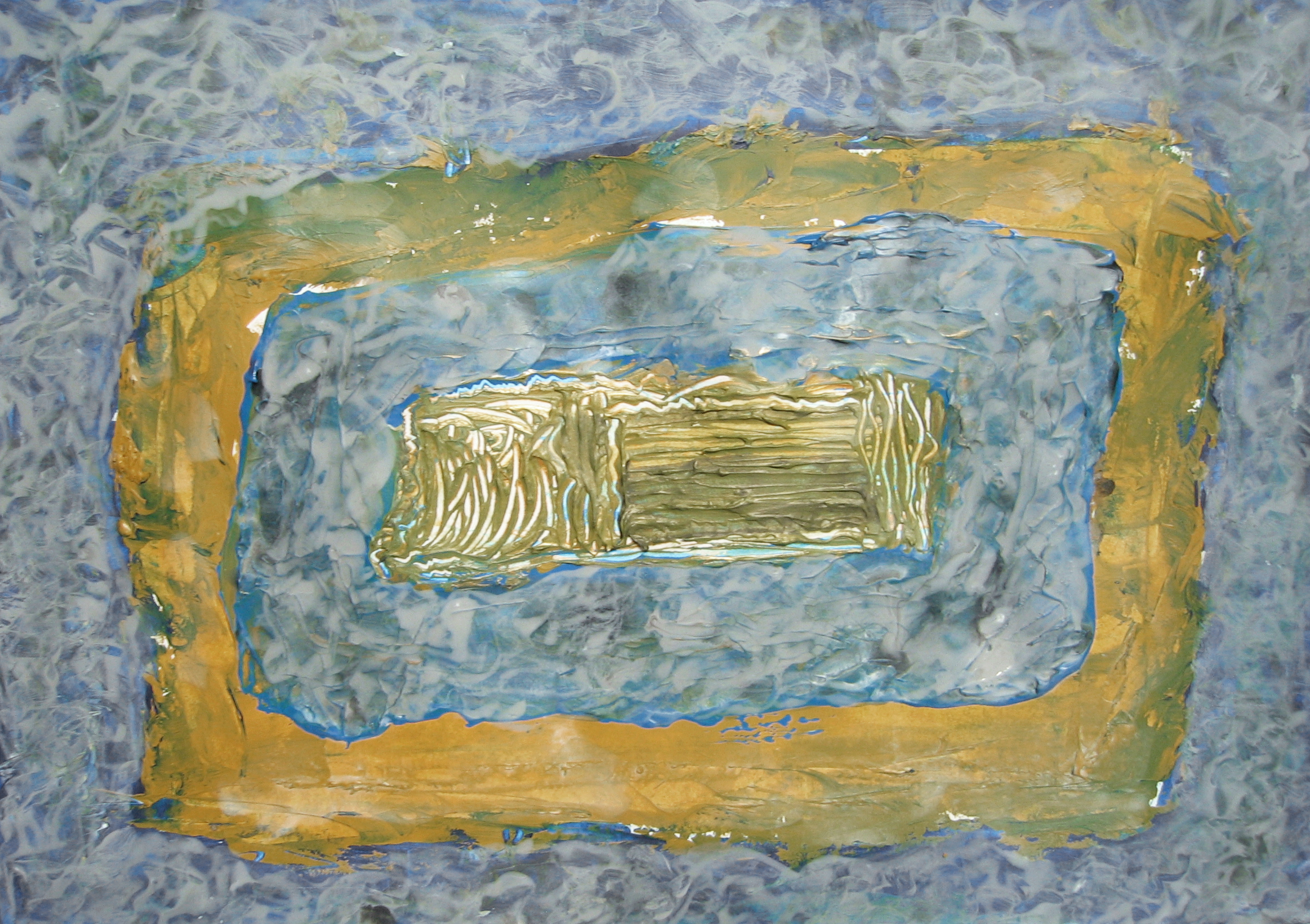 “Rectangular Monument Abstract – Monochrome” retains the original textures in the blue painting prior to the grey wash. I will show you the earlier cerulean blue draft at the end of this article.