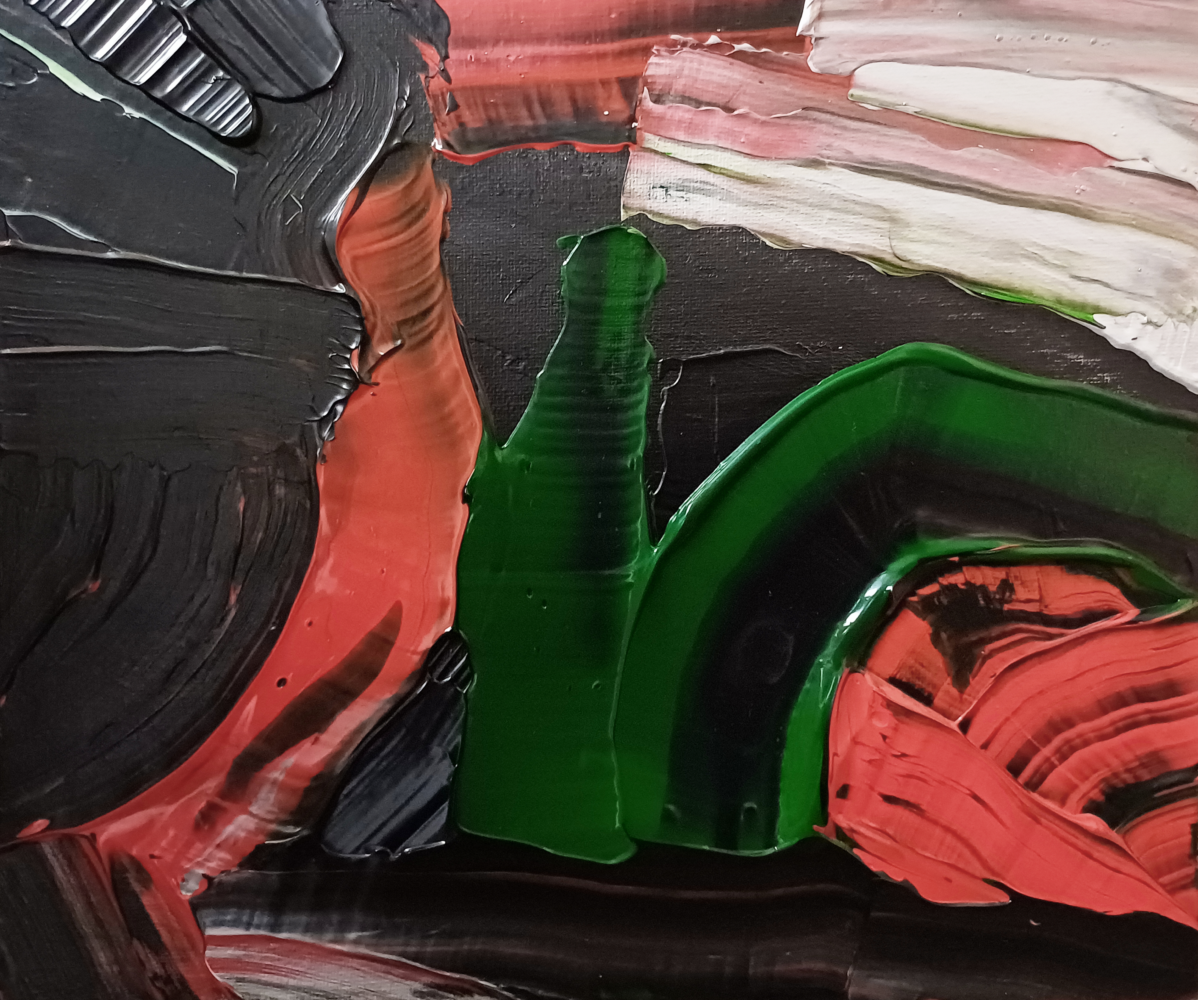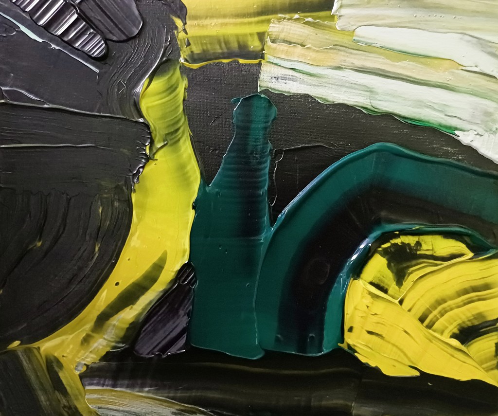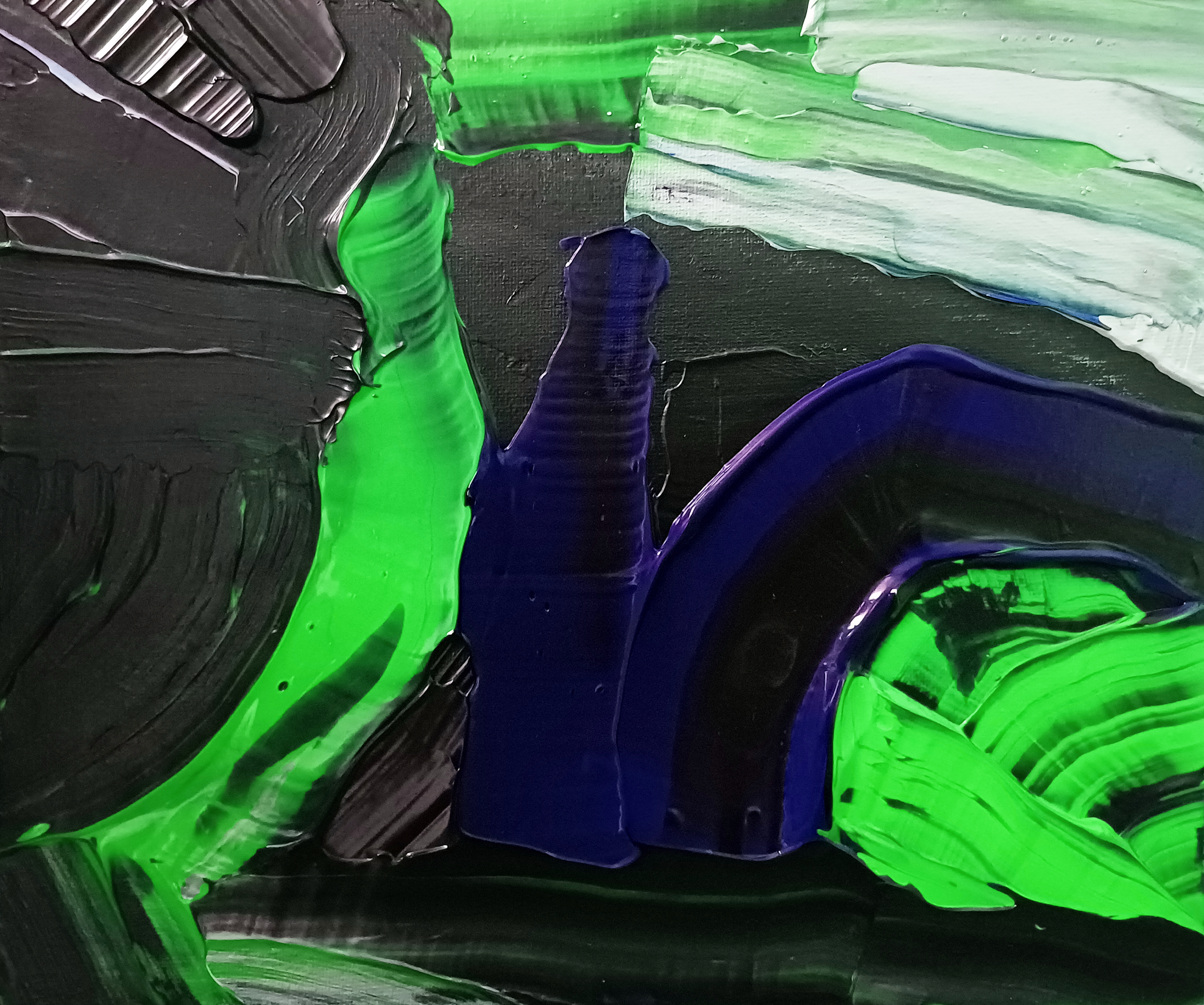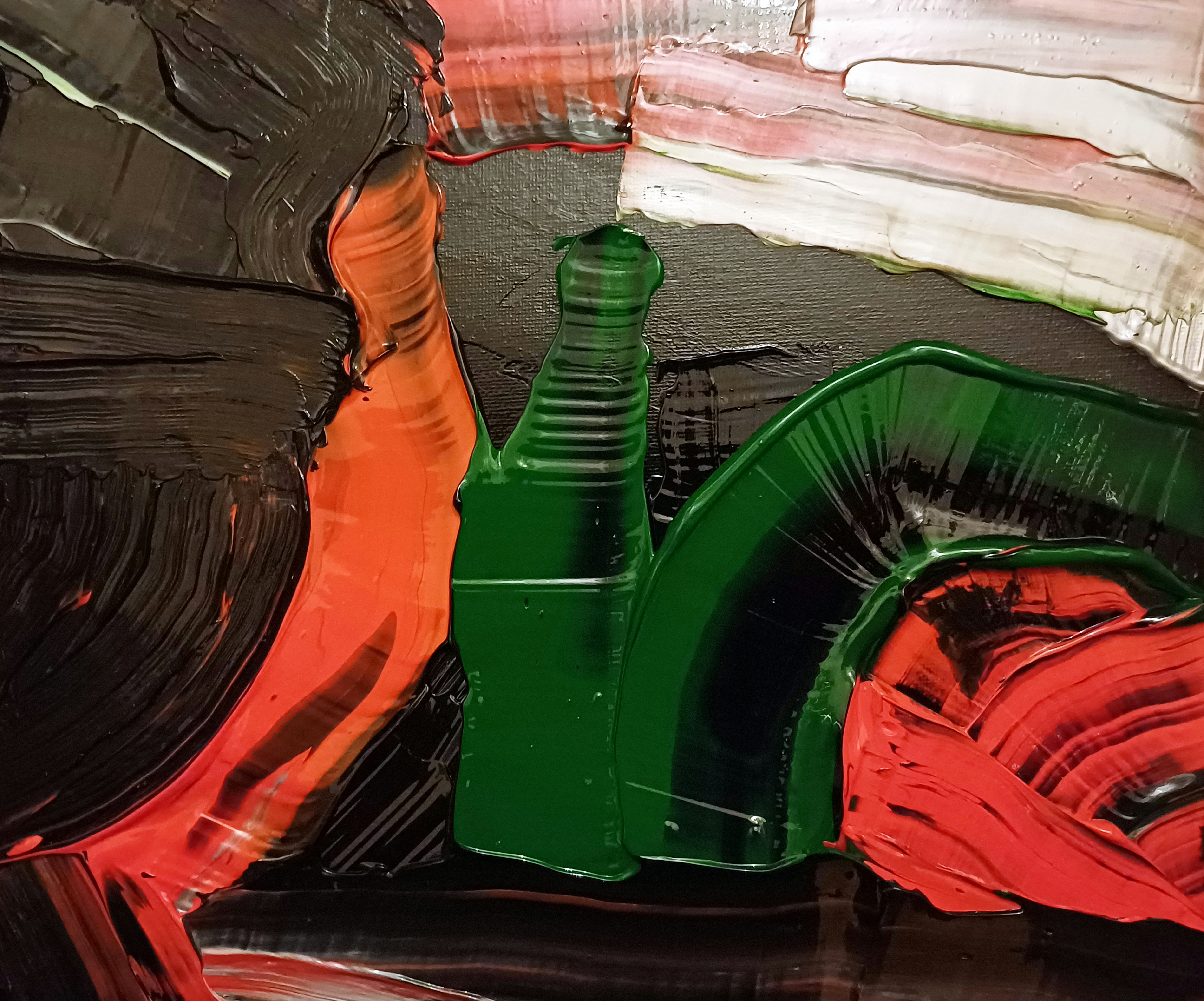 Please note colour balancing might vary upon your screen due to differing light conditions and wet paint at the time of photography. You can note the textured Mars Black overpainting I introduced at the top-left by comparing this 2256hrs wet paint photograph with the finissimo piece at the top of this article.