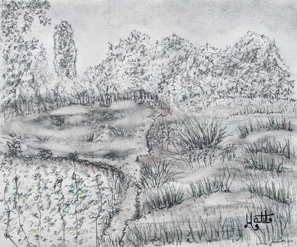 “Sunlight at Wren’s Nest Pond” [31st January 2022] by Matt The Unfathomable Artist, sketch with H, HB, 4B and 8B pencils, signed in black ink on 280gsm 250mm x 300mm gesso primed canvas [pad], digital image 3480 x 2963 pixels.