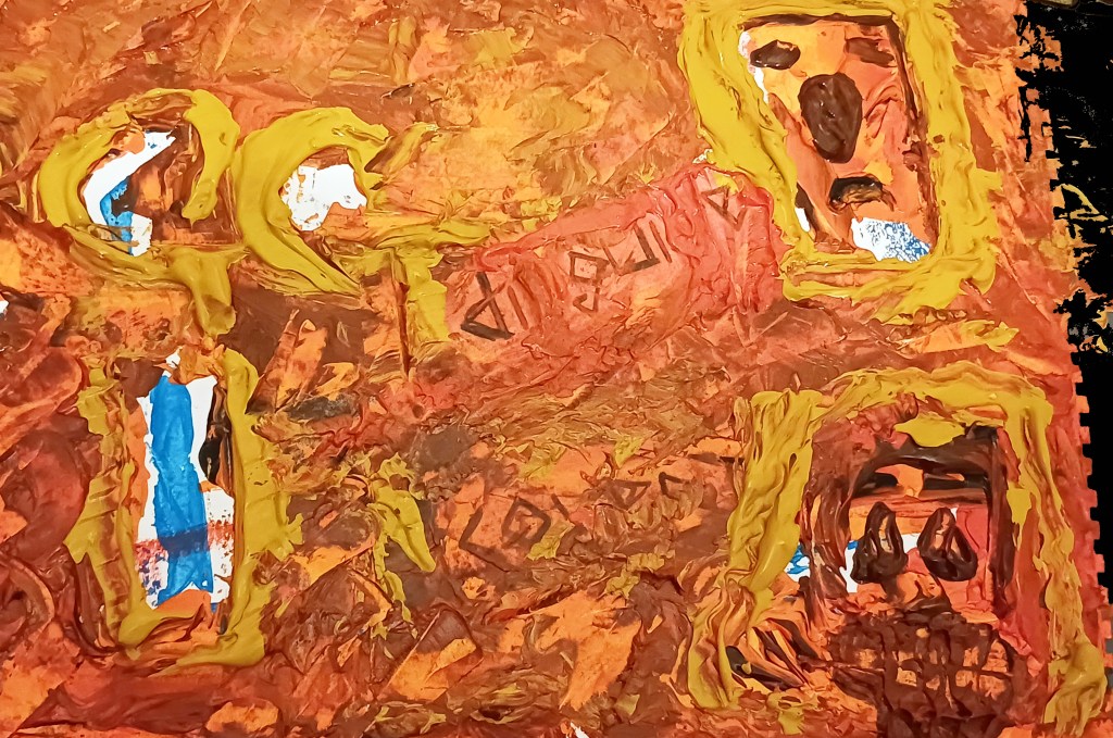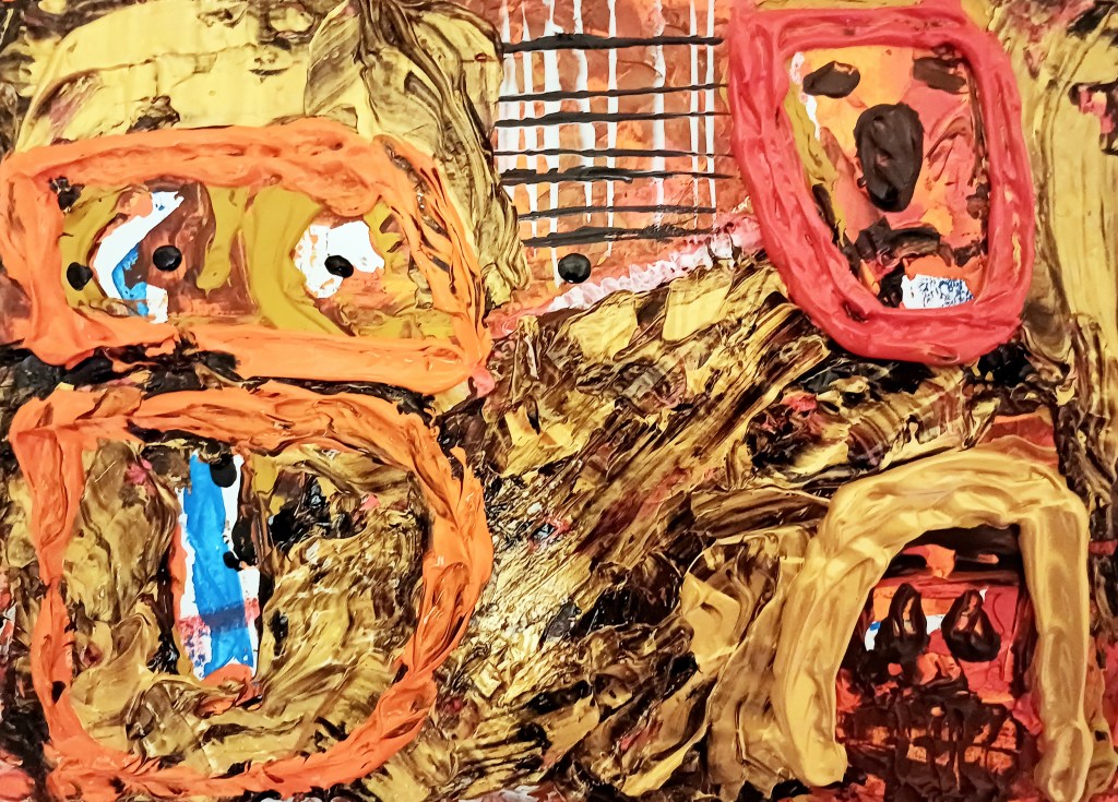 The hair for the large left face is pure chance in that I never intended to actually paint hair! I thought of Andy Warhol by the time I made divers goggles around the eyes. It was also here I loved the way the unintended hair looked. I literally wanted a nice background as I paletted gold paint onto the canvas.