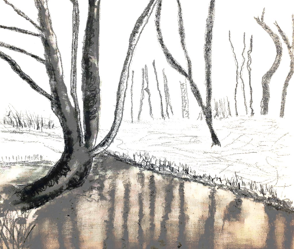 .. the first input source for my 3×2 Collage is the 1612 Oak in landscape, ancient and gnarled, holding its ground against the weather. Regularly enjoying the oft marshy, water-retaining field I’ve affectionately called King James Meadow (of VI & I fame).