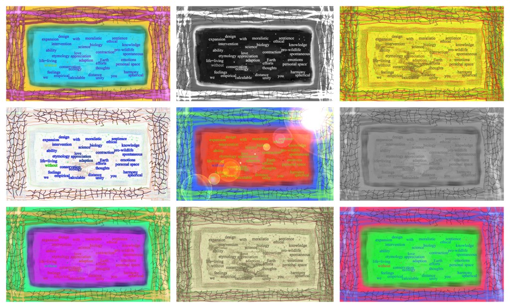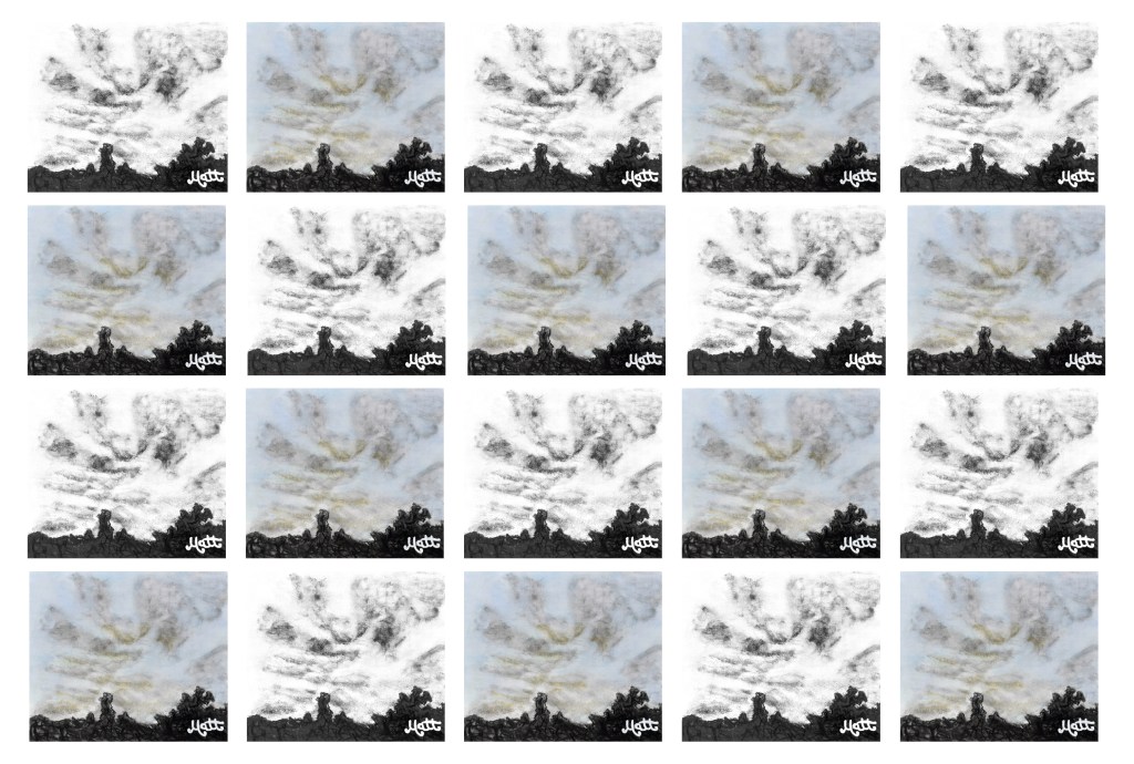 Icy blues and blazoned horizon settle into a steady awareness, repeated into a 3×2 grid that beautifully echoes both film frames and pop art history. My subconscious naturally draws upon interconnected themes, like an artisanal builder selecting the finest materials.