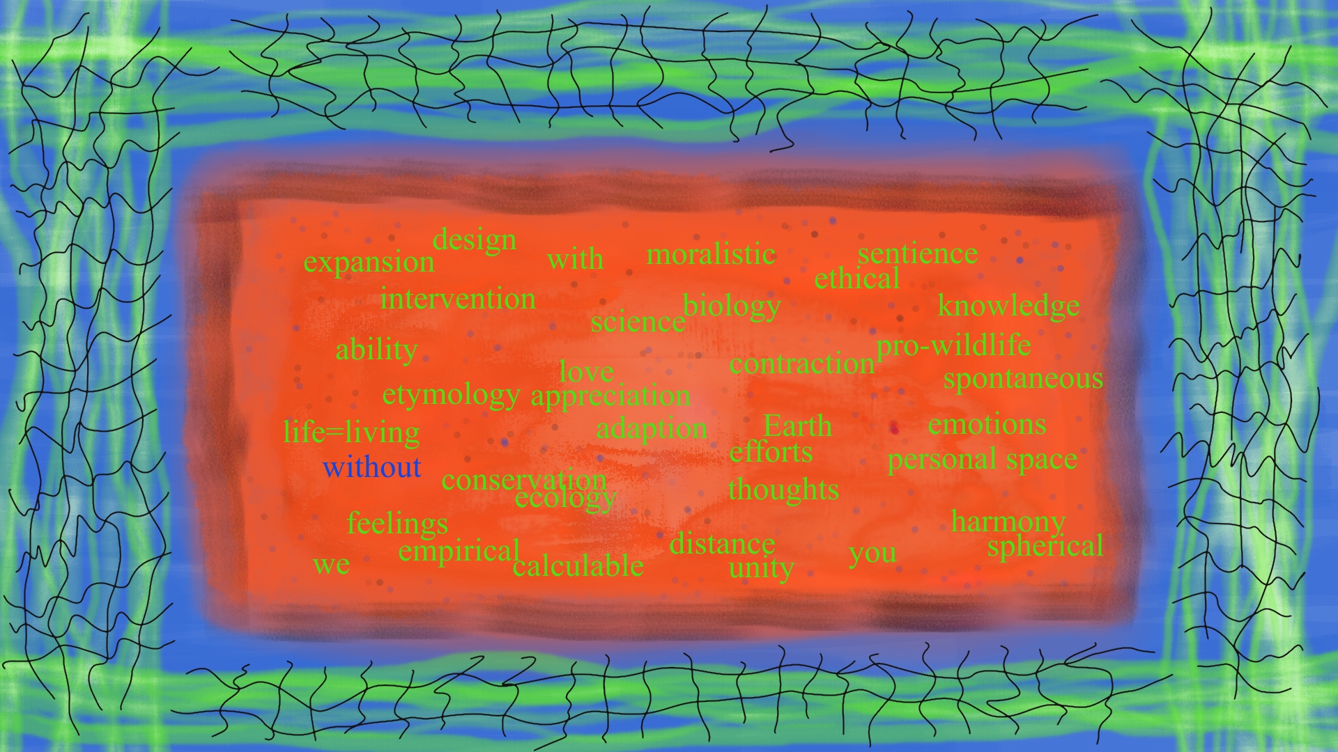In “Oak Eyes” I have stripped away the expected greens and browns of the English countryside to reveal a heightened chromatic vibrancy, an amalgamation of ideas brought into focus.