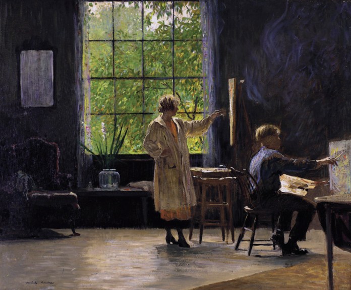 ‘Students of Painting’ [1923] by Daniel Garber, Oil on compositional board, 18 inches (h) x 21 15/16 inches (w).