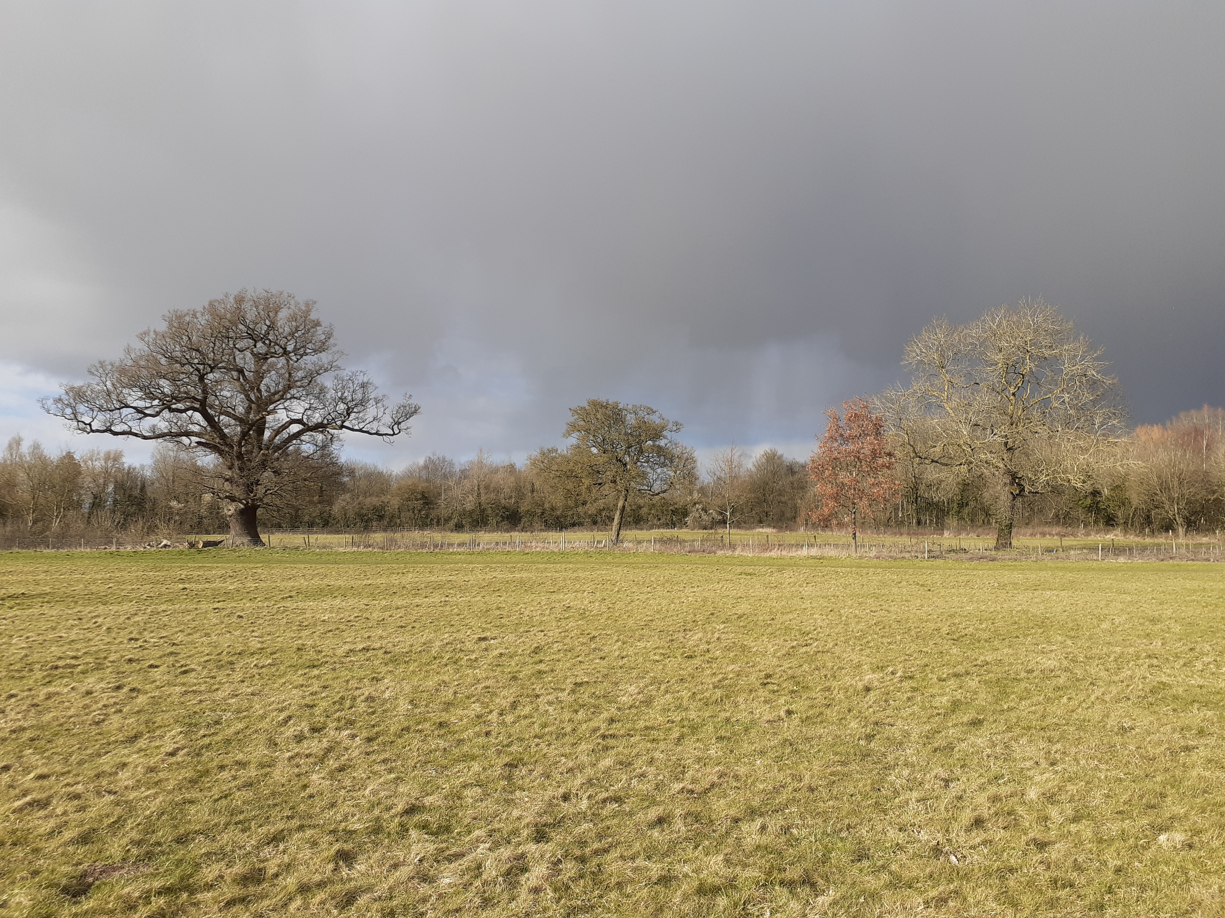 It was an early evening. Curtains drawn. No natural light to make use of. Working from a photograph dated 13th March 2021 taken at 1522hrs (see below). It was one of several compositions standing in the field, others shot in varying directions. I even kept some of the blue sky poking out to the centre-left for authenticity.