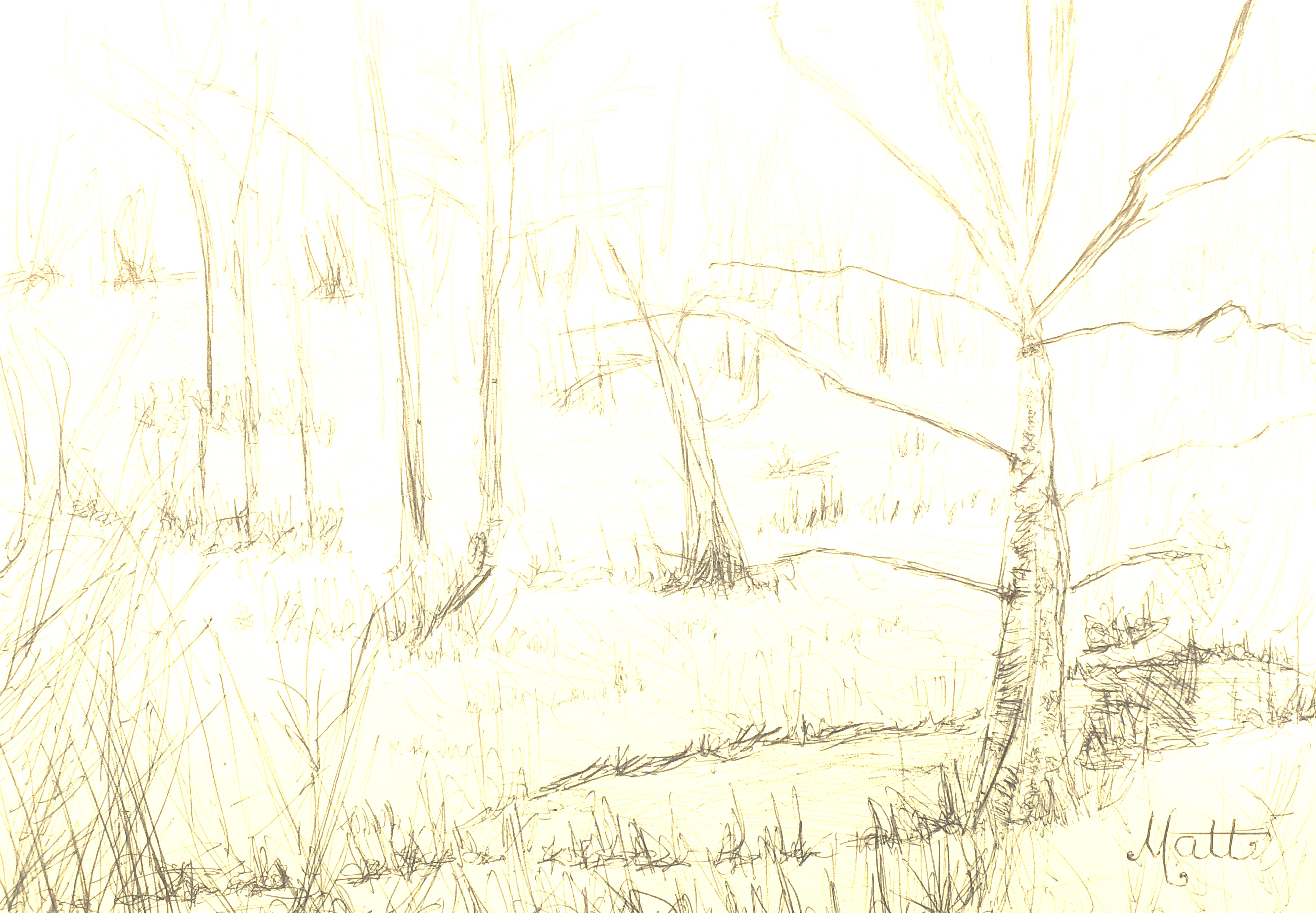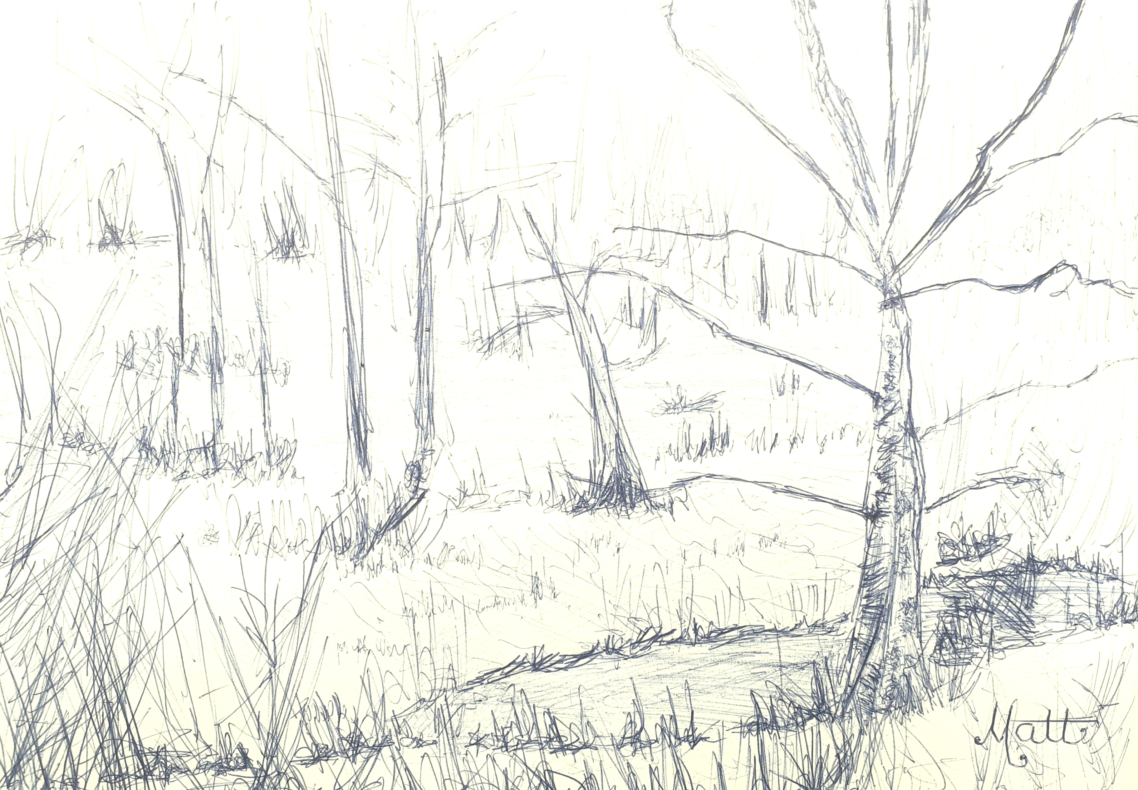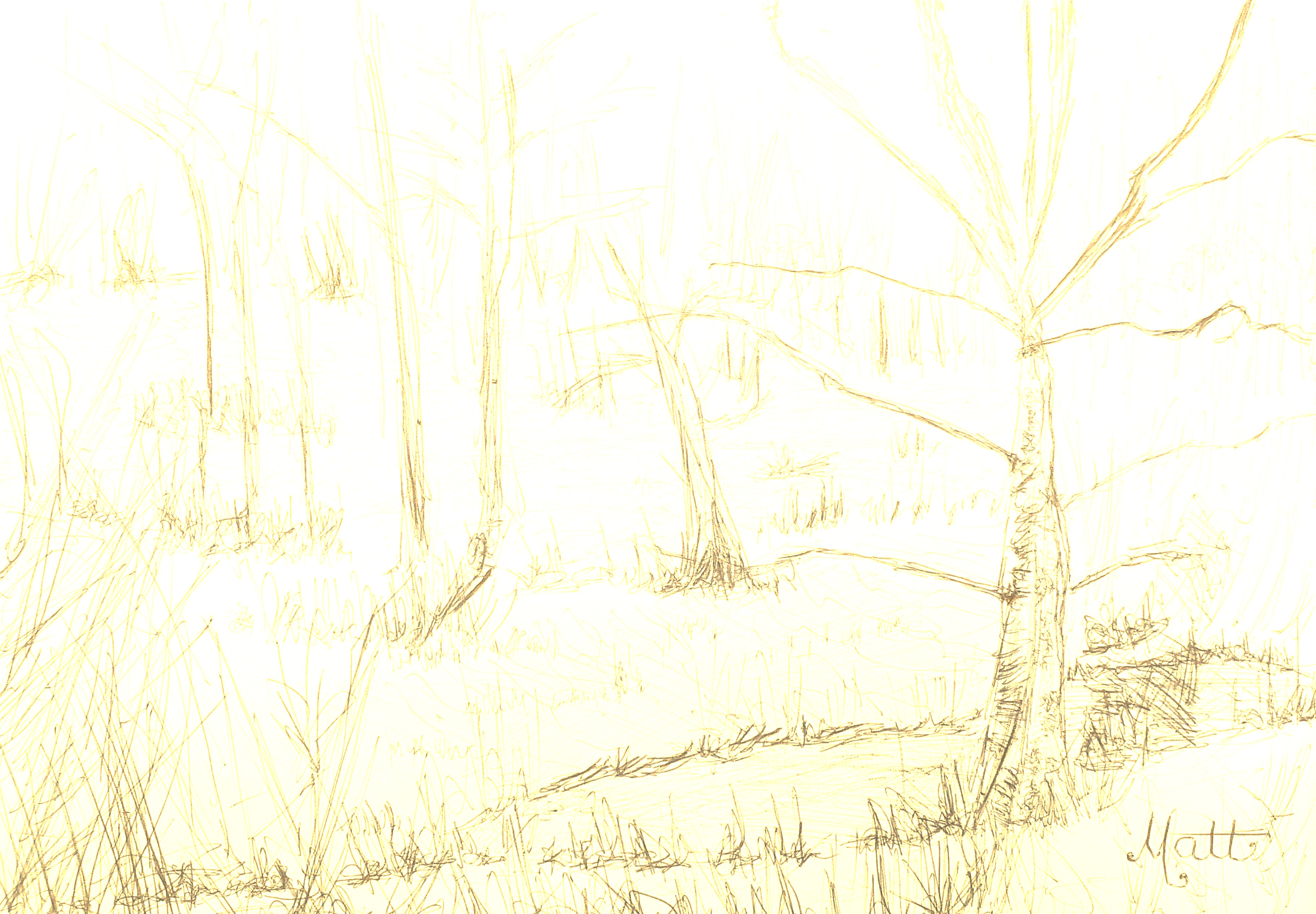 The first image from my quick sketch study #1 in blue ink pen entitled “Wrens Nest Wood – 5800K photograph version” explains how digitally adjusting the ‘Kelvin’ colour temperature scale of an electronic photograph changes its visual pleasance.