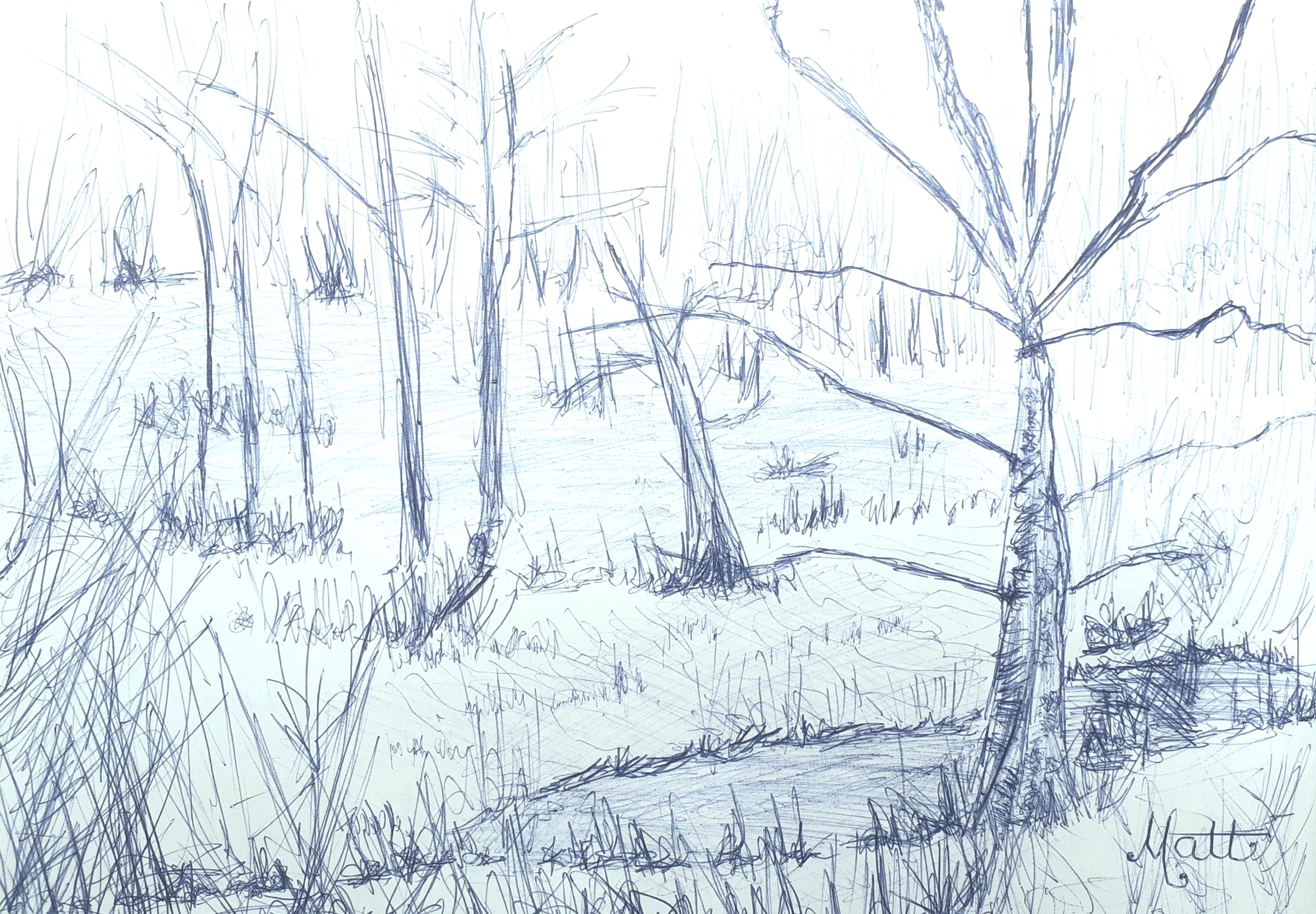We see within this series of five digital photographs from my original “Wrens Nest Wood” [blue ink pen, sketch study #1 on A4 80gsm paper] the harsh environmental effect burning colour from our natural wooded landscape causes!