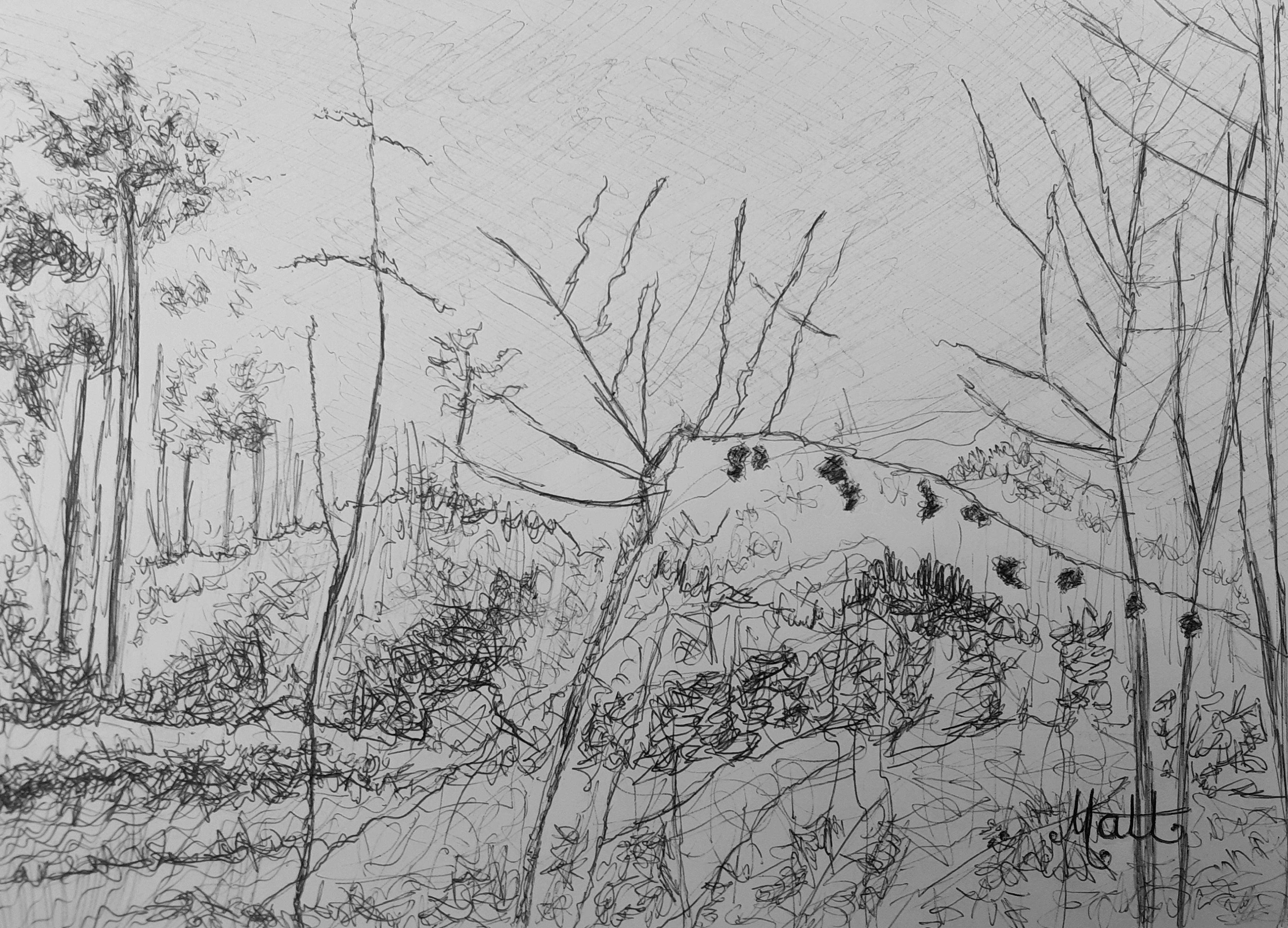 We see within this series of five digital photographs from my original “Wrens Nest Wood” [blue ink pen, sketch study #1 on A4 80gsm paper] the harsh environmental effect burning colour from our natural wooded landscape causes!