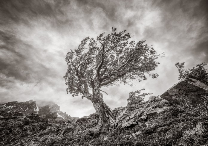 ‘lenga aguntando el viento en paine con cielo nuboso’ translates as the ‘Lenga Beech Endures The Wind In Pain with The Cloudy Sky‘ in English – please see the windswept tree photo, above.