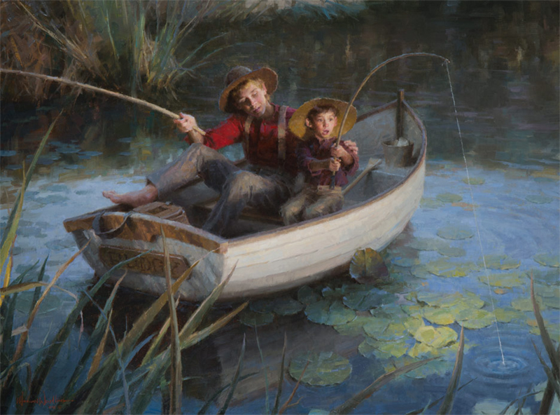 Titus works almost entirely with palette knives requiring the artisan skill and steadiness of surgeons who are themselves masters at their work. Titus’ style, as discussed in a previous blog about Morgan Weistling [My Morgan Weistling Blog Writeup] demonstrates a strong story-telling acumen within his art. Whereas Weistling prefers a romantic style, Titus is pragmatic and practical in depicting many of his life scenes.
