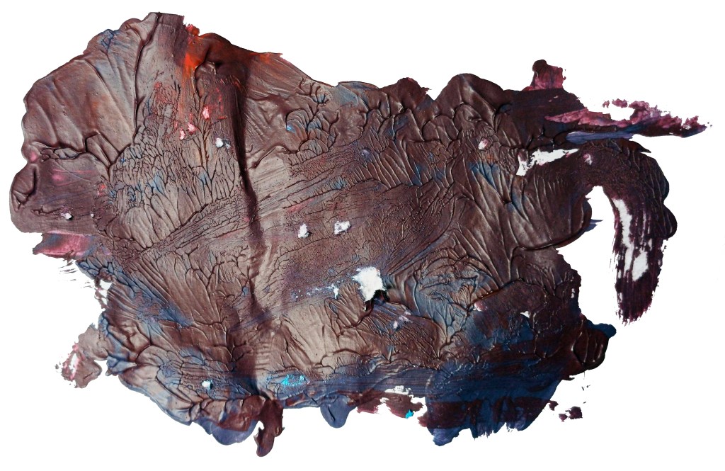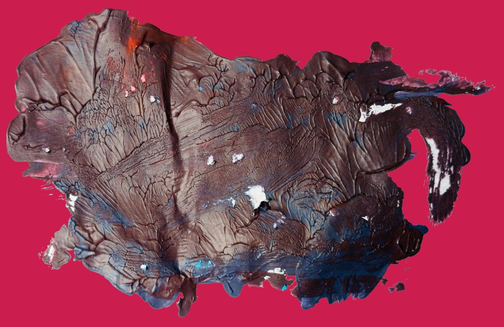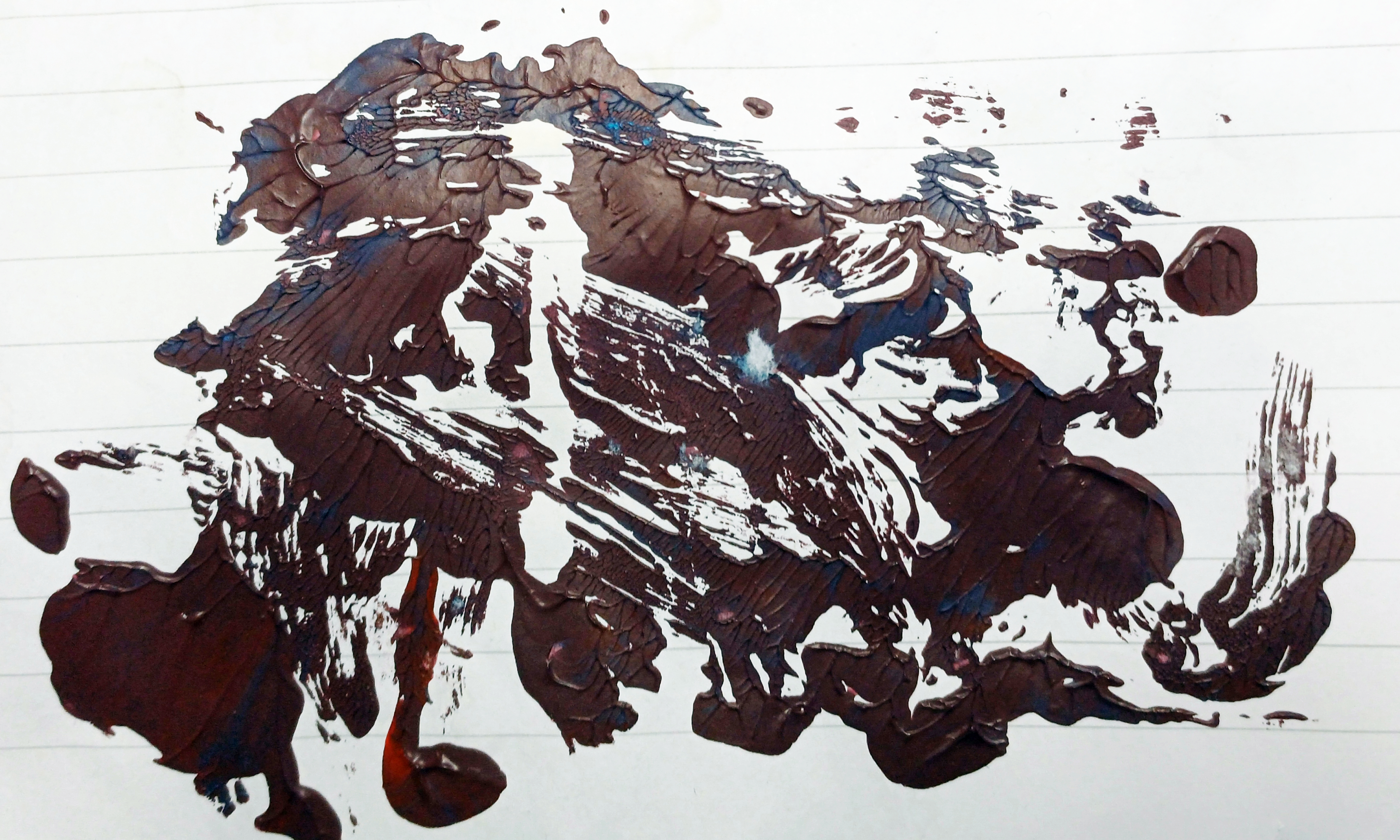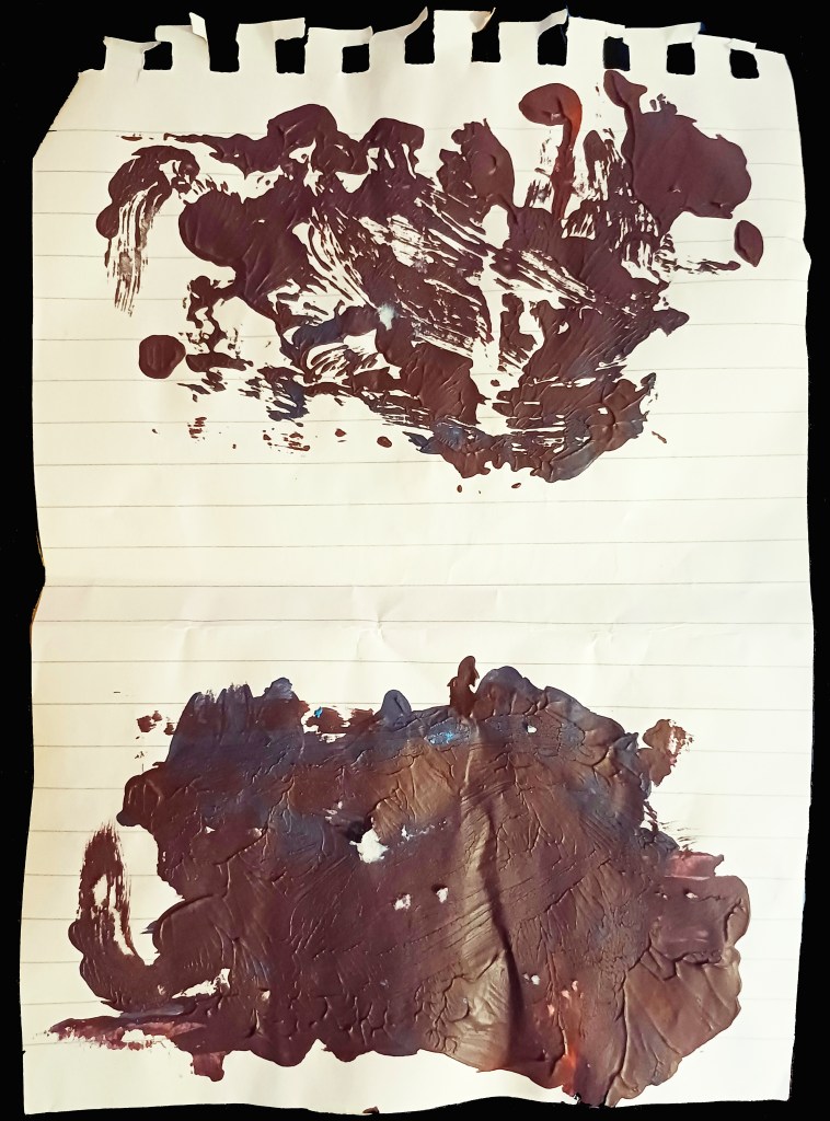 Imagine the plain paper of the as yet “Unfathomable Apocalypse Rider” folded on top being pressed into the (Upper or bison) random acrylic mixed paint half of the notepad paper.