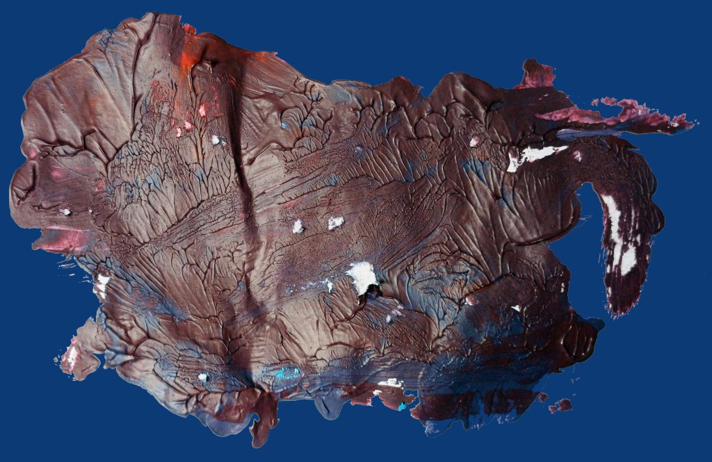 “If I told you the perceivable landmass you see is 100% completely random paint mixing would you believe me? The beautiful leaf-like striations occurred through my pressing this Upper half against the folded Notepad paper at the centre.