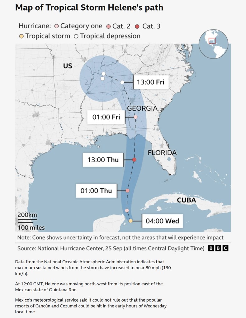 ‘Map of Tropical Storm Helene’s path’ courtesy of the BBC, 25th September 2024.