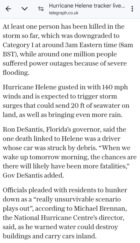 ‘Hurricane Helene tracker, image one’ courtesy of The Telegraph, 27th September 2024 screenshot.