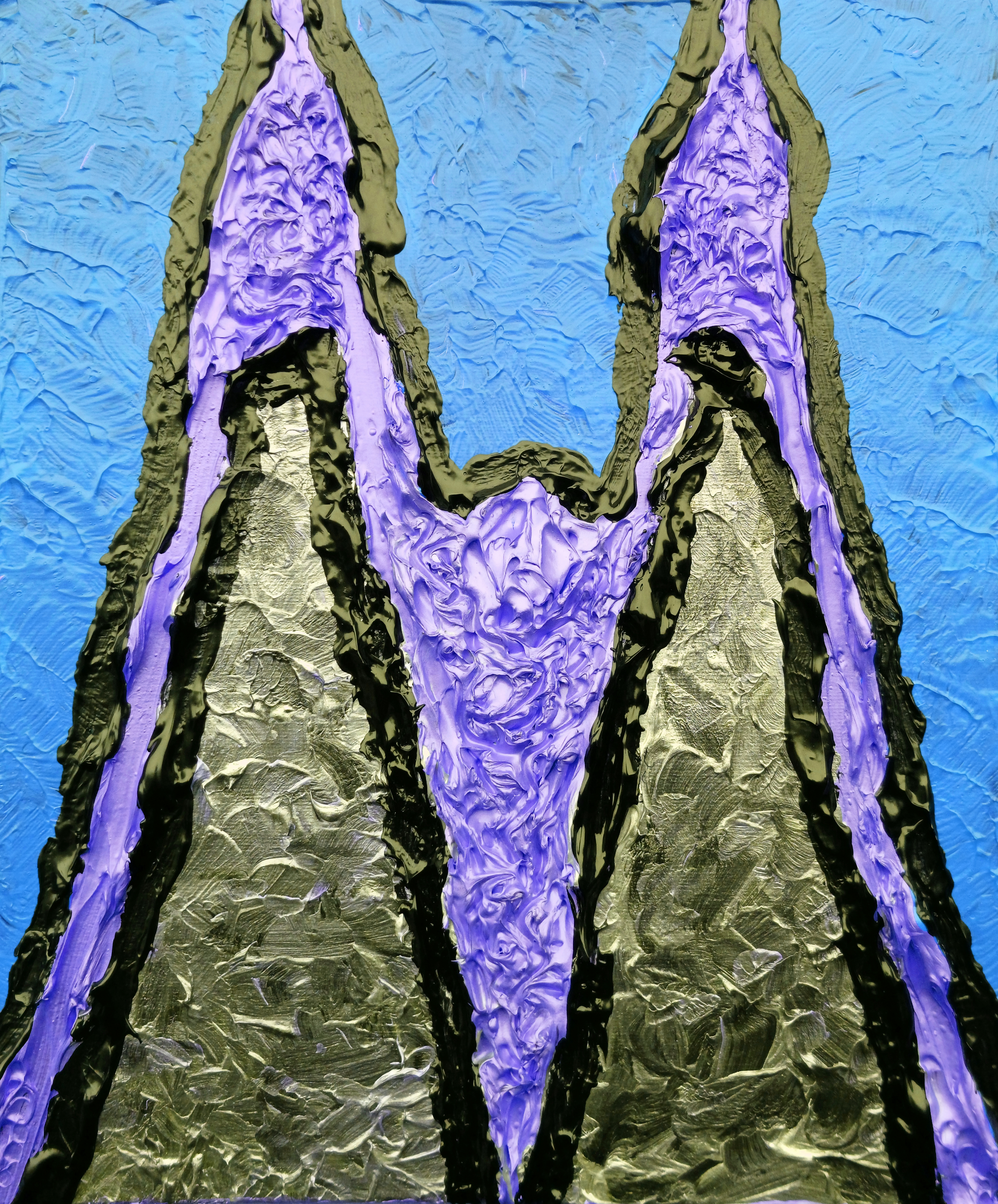 The majority of the gold texture in “Comic Book Series [Letter M]” is produced through brushwork ‘fluting’, after careful palette knife placement of the gold.
