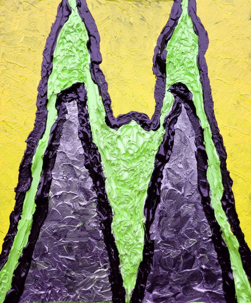 “Comic Book Series [Letter M]” [2nd November 2024, photograph 4th November 2024] by Matt The Unfathomable Artist, acrylic Pop Art painting on 100% pure cotton triple-gesso primed canvas board, 10 in x 12 in (25.4cm x 30.5cm), 6000 x 7261 pixels.