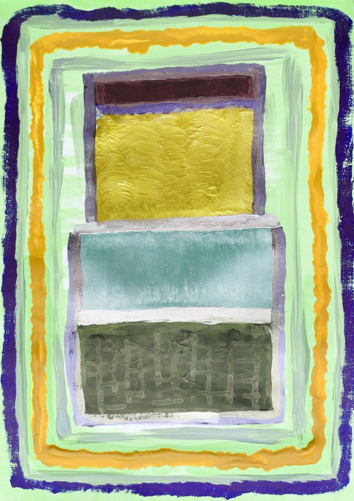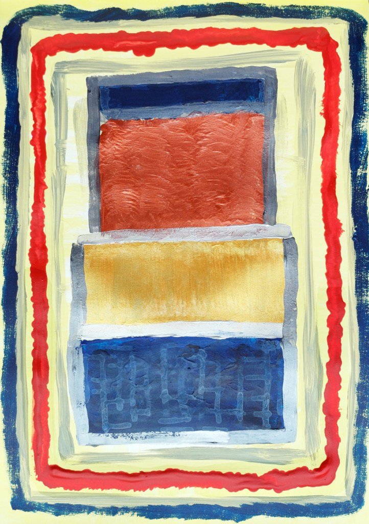 “Copper Gold Boxes with Blue & Red Rectangles” [14th March 2024] by Matt The Unfathomable Artist, acrylic Abstract fine art painting on A3 250g mixed media paper, 3000 x 4253 pixels image.
