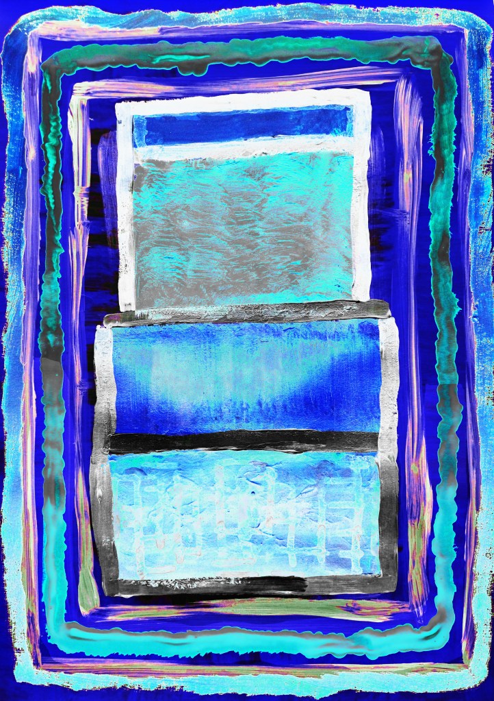 “Cyan Blue Boxes with Cyan & Magenta Rectangles” is one of my SolarScapes. I muted overly attentive warm colours to bring the perfect harmony to this piece.