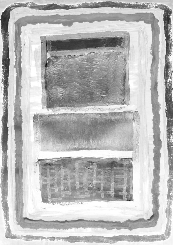 “Monochrome White Grey Black Rectangles with Chalk Clay” is spiritual, ethereal.