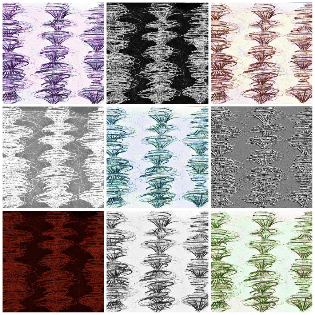 My artwork (in each grid) is composed of one continuous spiral meandering throughout the canvas with multiple complimentary random lines. I utilised three professional Artists’ software packages to produce this work.