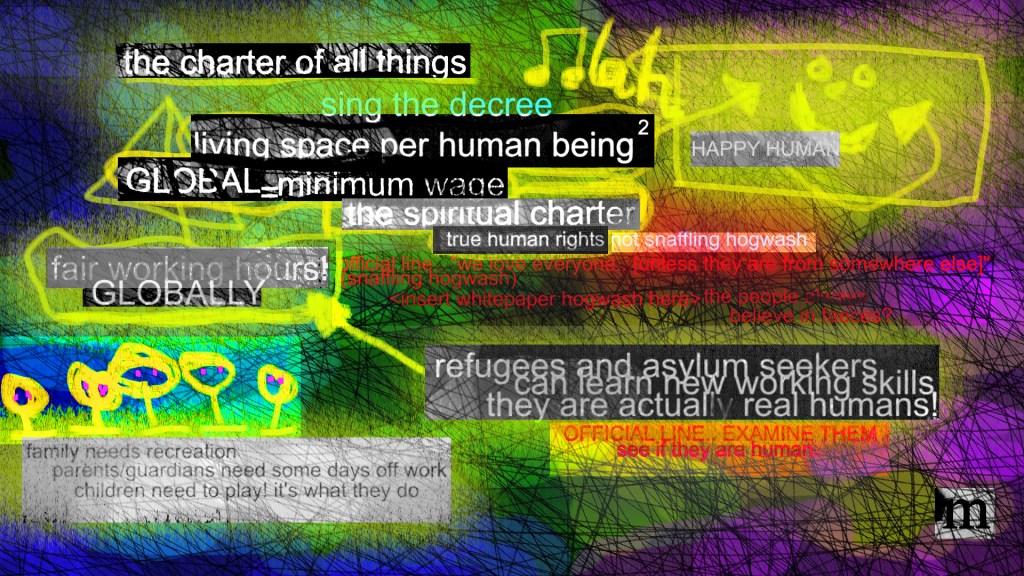 - second batch of mixed red/blue-to-pseudo-purple paint added around smaller boxes and underneath the overpainted green dash dots below ‘UN‘. I called this latter area ‘the seated dash dots‘ as some days afterwards this is how I myself interpreted this. Please do see “Mapped Random Satellite {Day} #1” as I believe this is my subconscious finding its way into UN noise dash dot. Interestingly the seated shape of these dash dots is pure chance to fill negative canvas space!