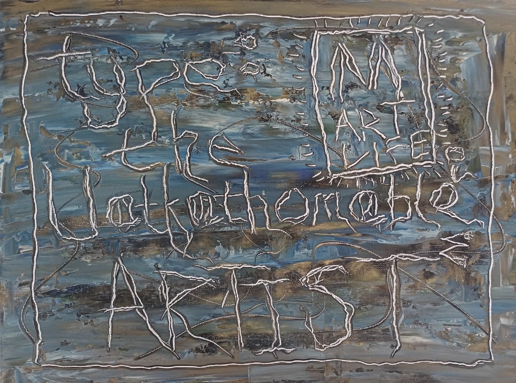 This piece is founded from my past works with the same message (‘type: the Unfathomable ARTIST‘) portraying multiple ideas and themes. To date I have made oils, iron gall ink and (now) acrylic works with this title.