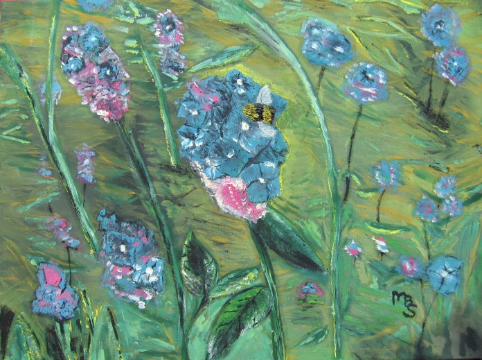It was at this point I added the mid-yellow even though this was an intended colour to use from the outset. I flattened the profile of the turquoise surrounds for visual interest with a flat-paintbrush. The grass-green received an area of purposed flattening due to the paint settling on the canvas.