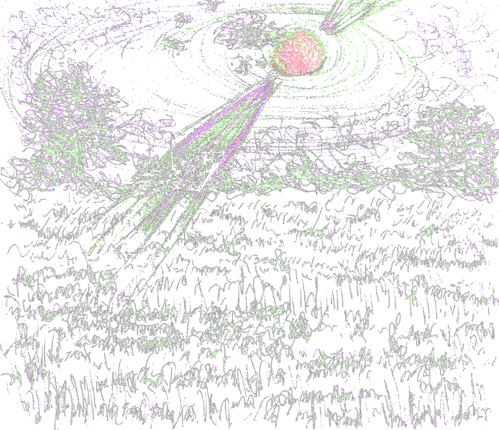 For the primary working I utilised three painting techniques: palette knife, paintbrush motions using approximately four brushes, and constant-direct tube paint applications onto the canvas for the grass-green and turquoise surrounds.